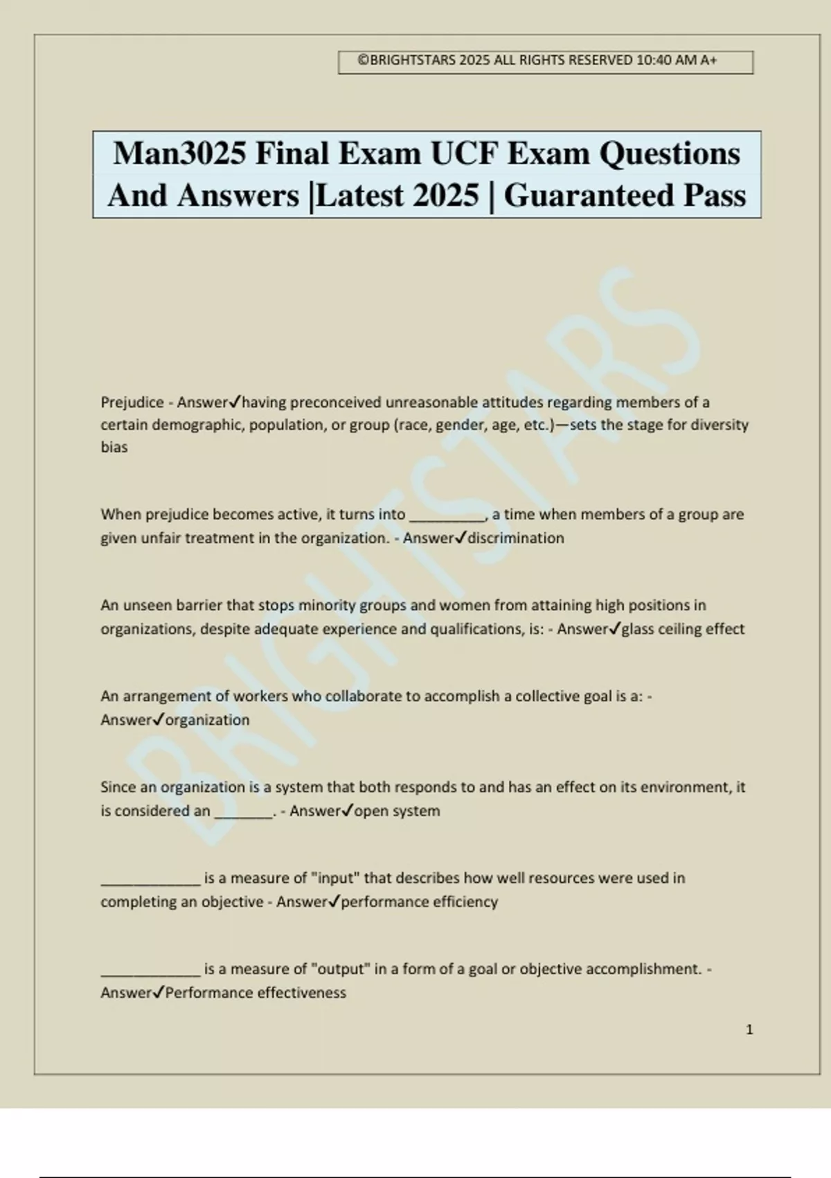 Man3025 Final Exam UCF Exam Questions And Answers |Latest 2025 | Guaranteed Pass