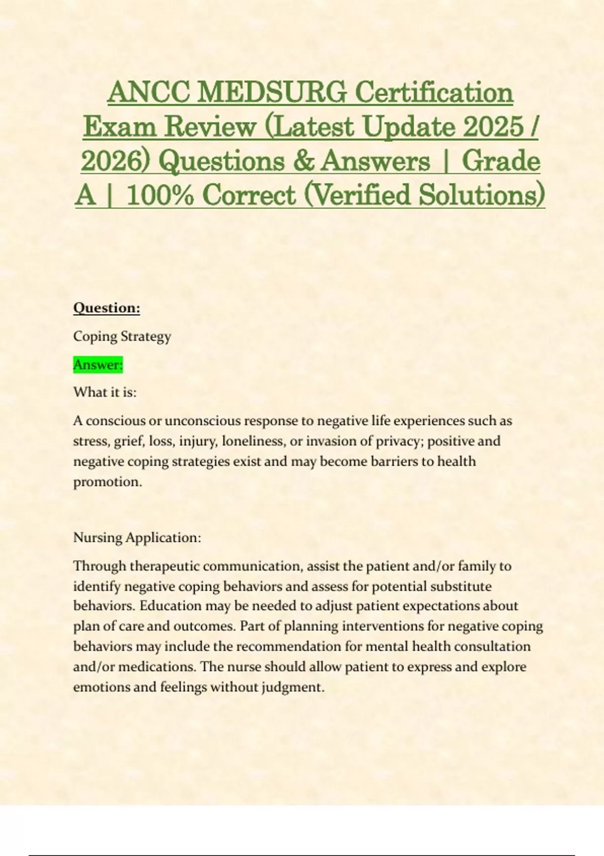 ANCC MEDSURG Certification Exam Review (Latest Update 2025 / 2026) Questions & Answers | Grade A | 100% Correct (Verified Solutions) Question: Coping Strategy Answer: What it is: A conscious or unconscious response to negative life experiences such as stress, grief, loss, injury, loneliness, or invasion of privacy; positive and negative coping strategies exist and may become barriers to health promotion. Nursing Application: Through therapeutic communication, assist the patient and/or family to identify negative coping behaviors and assess for potential substitute behaviors. Education may be needed to adjust patient expectations about plan of care and outcomes. Part of planning interventions for negative coping behaviors may include the recommendation for mental health consultation and/or medications. The nurse should allow patient to express and explore emotions and feelings without judgment. Question: Management Terms Answer: Utilization review: the detailed evaluation of health-care services provided to patients for necessity and cost-effectiveness; also monitors quality of care Risk management: the process of identifying, assessing, and prioritizing risks; goal is to prevent accidents and injuries, and control liability Performance improvement: the measurement of current performance and the implementation of methods to focus and improve performance to better meet the goals of the organization Case management: provides cost-effective continuity of care by linking people across clinical settings best suited to meet the patient needs Managed care: provides continuity of care by linking tasks and department functions within an organization Question: Trend Data Analysis (TDA) Answer: What it is: The use of past and/or present data to predict future problems, outcomes, costs, and more by identifying and monitoring trends. Nursing Application: TDA is used heavily in the nursing field. Everything from error trends related to length of nursing shifts to predicting the likelihood that DVTs will result in to increase the minimum education level of staff RNs. Healthcare facilities use TDA to proactively alter treatment protocols, staffing ratios, and provision of specialized services based on costs, community disease trends, and insurance reimbursements. Question: Conflict Resolution Answer: What it is: The process of facilitating a peaceful end to conflict and retribution; closely connected with the concept of negotiation. Nursing Application: Conflict usually results from deep p