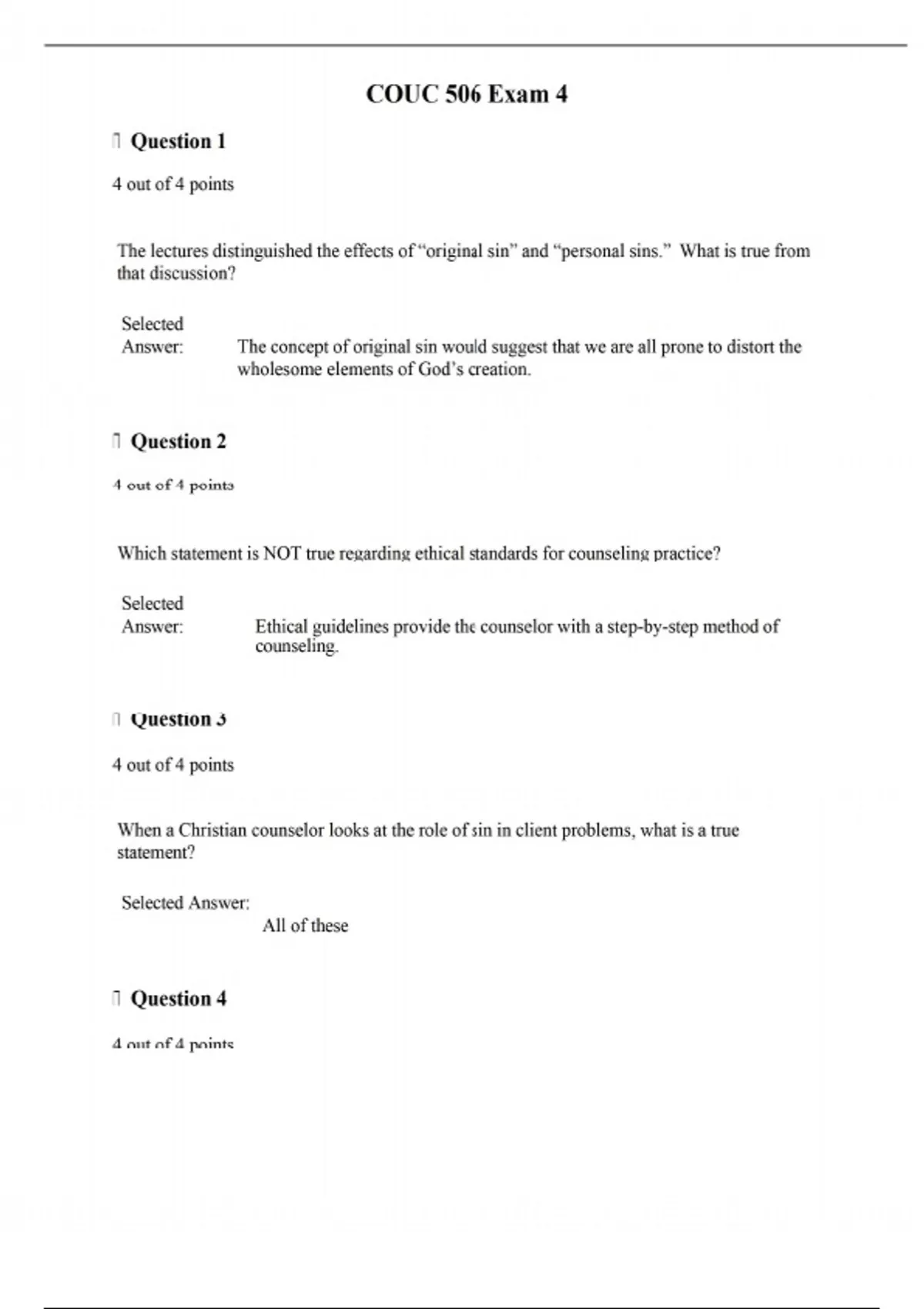 Question 1 4 out of 4 points The lectures distinguished the effects of “original sin” and “personal sins.” What is true from that discussion? Selected Answer: The concept of original sin would suggest that we are all prone to distort the wholesome elements of God’s creation. Question 2 4 out of 4 points Which statement is NOT true regarding ethical standards for counseling practice? Selected Answer: Ethical guidelines provide the counselor with a step-by-step method of counseling. Question 3 4 out of 4 points When a Christian counselor looks at the role of sin in client problems, what is a true statement? Selected Answer: All of these Question 4 4 out of 4 points McMinn emphasizes that the counselor’s motivation needs to be examined as the counselor confronts the client. What is a true statement based on that discussion? Selected Answer: All of these are true Question 5 4 out of 4 points The lectures reviewed Nouwen’s concept of “hospitality” in counseling. What is true from that discussion? Selected Answer: Simply welcoming a counselee in need can have positive therapeutic effects Question 6 4 out of 4 points McMinn (as reviewed in the lectures) describes several ways to confront sin in the life of a counselee. What factors should a counselor take into account before choosing one of the confrontation techniques? Selected Answer: Whether a trust relationship has been established between the counselor and client