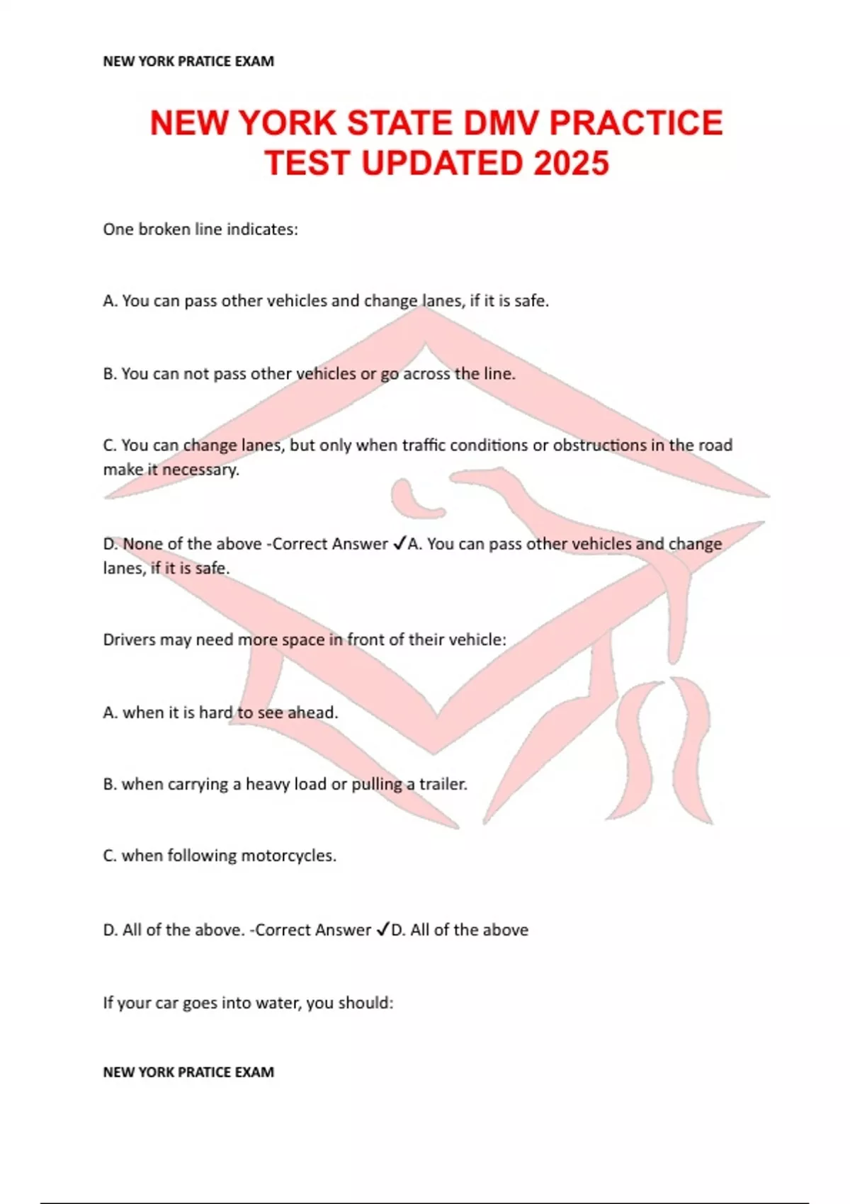 One broken line indicates: A. You can pass other vehicles and change lanes, if it is safe. B. You can not pass other vehicles or go across the line. C. You can change lanes, but only when traffic conditions or obstructions in the road make it necessary. D. None of the above -Correct Answer A. You can pass other vehicles and change lanes, if it is safe. Drivers may need more space in front of their vehicle: A. when it is hard to see ahead. B. when carrying a heavy load or pulling a trailer. C. when following motorcycles. D. All of the above. -Correct Answer D. All of the above If your car goes into water, you should: A. wait for water to rush in and let it out in small breaths through your nose. B. remove yourself before it starts to sink. C. call the fire department immediately. D. None of the above. -Correct Answer B. remove yourself before it starts to sink. The NYS law requires drivers to use their headlights: A. from one-half hour after the sun sets to one-half hour before the sun rises. B. when visibility is less than 1,000 feet. C. when they use their windshield wipers to clear rain, fog or snow. D. All of the above. -Correct Answer D. All of the above When drivers come to this sign, they must: A. be ready to stop at the stop sign. B. stop what they are doing. C. warn other drivers that a stop sign is ahead. D. brake sharply and come to a complete stop. -Correct Answer A. be ready to stop at the stop sign. This is: A. a reduction of lanes sign. B. a right curve sign C. a merging traffic sign D. a side road sign -Correct Answer D. a side road sign What does this 'Soft Shoulder' sign indicate? A. Drivers should leave the pavement immediately. B. Drive on the shoulder if you have soft tires. C. The dirt on the side of the road is soft. D. None of the above. -Correct Answer C. The dirt on the side of the road is soft. What does a NO STANDING sign mean? A. Drivers can not stand in front of parked vehicles. B. Vehicles can stop only to obey a traffic sign, signal or officer. C. Drivers must discharge passengers before leaving. D. Drivers can only make a temporary stop to load or drop off passengers. -Correct Answer D. Drivers can only make a temporary stop to load or drop off passengers. U-turns are illegal: A. on limited access expressways B. in school zones C. in business districts of New York City D. All of the above -Correct Answer D. All of the above For protection, motorcyclists are required to: A. wear approved helmets. B. keep their headlights and taillights on at all times. C. signal turns, lane changes and stops.