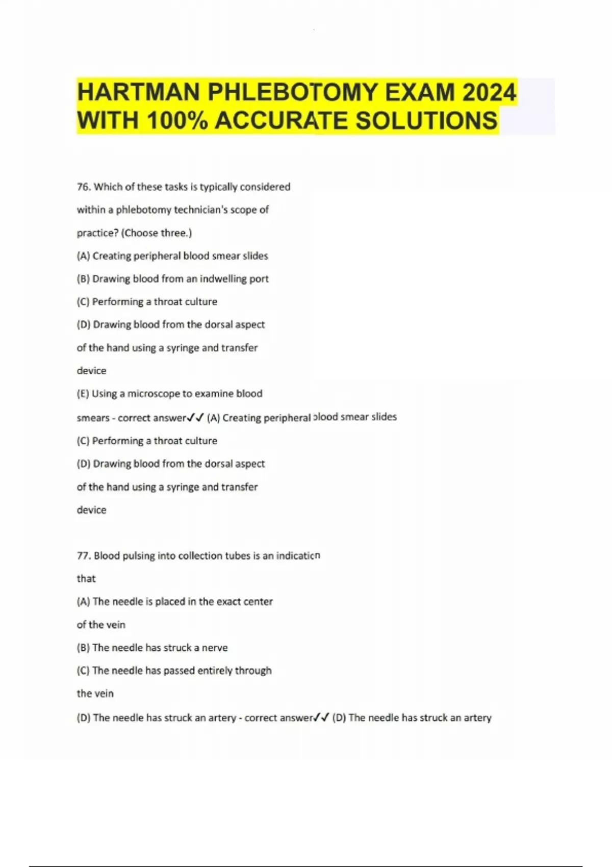 HARTMAN PHLEBOTOMY EXAM 2024 WITH 100- ACCURATE SOLUTIONS HARTMAN PHLEBOTOMY EXAM 2024 WITH 100- ACCURATE SOLUTIONS