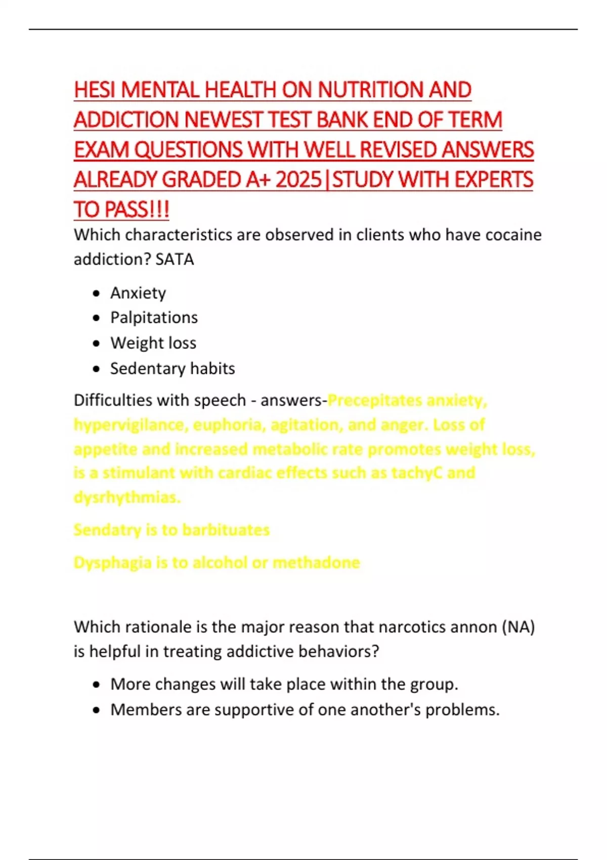 HESI MENTAL HEALTH ON NUTRITION AND ADDICTION NEWEST TEST BANK END OF TERM EXAM QUESTIONS WITH WELL REVISED ANSWERS ALREADY GRADED A+ 2025|STUDY WITH EXPERTS TO PASS!!!