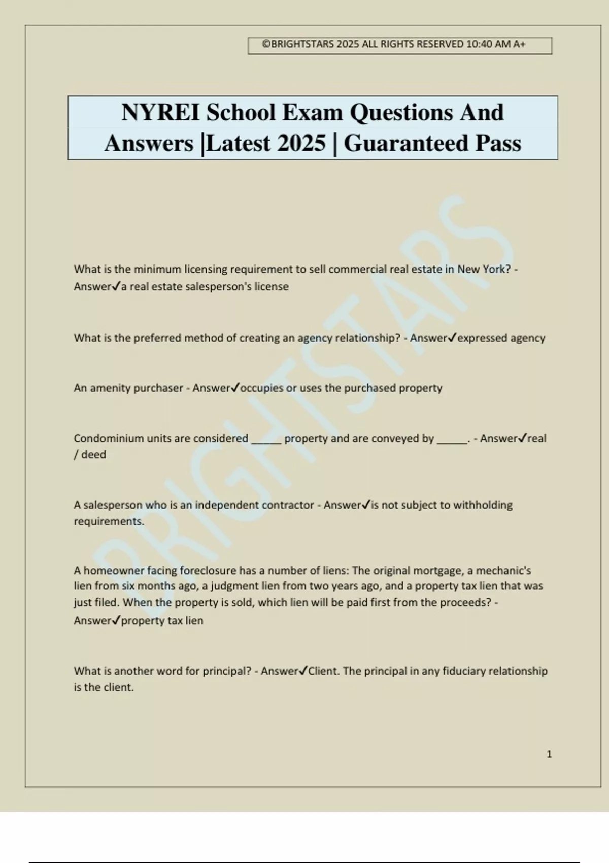 ©BRIGHTSTARS 2025 ALL RIGHTS RESERVED 10:40 AM A+ 1 NYREI School Exam Questions And Answers |Latest 2025 | Guaranteed Pass What is the minimum licensing requirement to sell commercial real estate in New York? - Answera real estate salesperson's license What is the preferred method of creating an agency relationship? - Answerexpressed agency An amenity purchaser - Answeroccupies or uses the purchased property Condominium units are considered _____ property and are conveyed by _____. - Answerreal / deed A salesperson who is an independent contractor - Answeris not subject to withholding requirements. A homeowner facing foreclosure has a number of liens: The original mortgage, a mechanic's lien from six months ago, a judgment lien from two years ago, and a property tax lien that was just filed. When the property is sold, which lien will be paid first from the proceeds? - Answerproperty tax lien What is another word for principal? - AnswerClient. The principal in any fiduciary relationship is the client. ©BRIGHTSTARS 2025 ALL RIGHTS RESERVED 10:40 AM A+ 2 The tenant signs a two-month lease on an apartment ending September 1. What type of leasehold estate does this represent? - Answerestate for years What are the age and experience requirements to apply for a salesperson license? - Answer18 years old and no experience necessary Craig owns a warehouse and his property taxes were recently raised. In turn, Craig charged the tenant currently occupying the building additional operating expenses. This is an example of - Answera pass-through. Which federal environmental law, known as the Superfund, creates requirements for closed and abandoned waste sites? - AnswerComprehensive Environmental Response, Compensation, and Liability Act Who is responsible for approving septic and other sanitation systems in New York State? - AnswerNYS Department of Health Who pays the property taxes in a triple net lease? - Answertenant Opal lives in an apartment that is going cooperative. The current residents are given the first option to buy in, and Opal decides to take advantage of the opportunity. Which statement about Opal's new co-op is FALSE? - AnswerShe will own the airspace inside her co-op fee simple. An example of chattel is - Answerwheat that has been harvested. A mortgage loan originator can perform each of these activities EXCEPT - Answerlend money. Which type of listing agreement provides the greatest opportunity for a listing broker to earn a commission? - Answerexclusive right to sell agreement