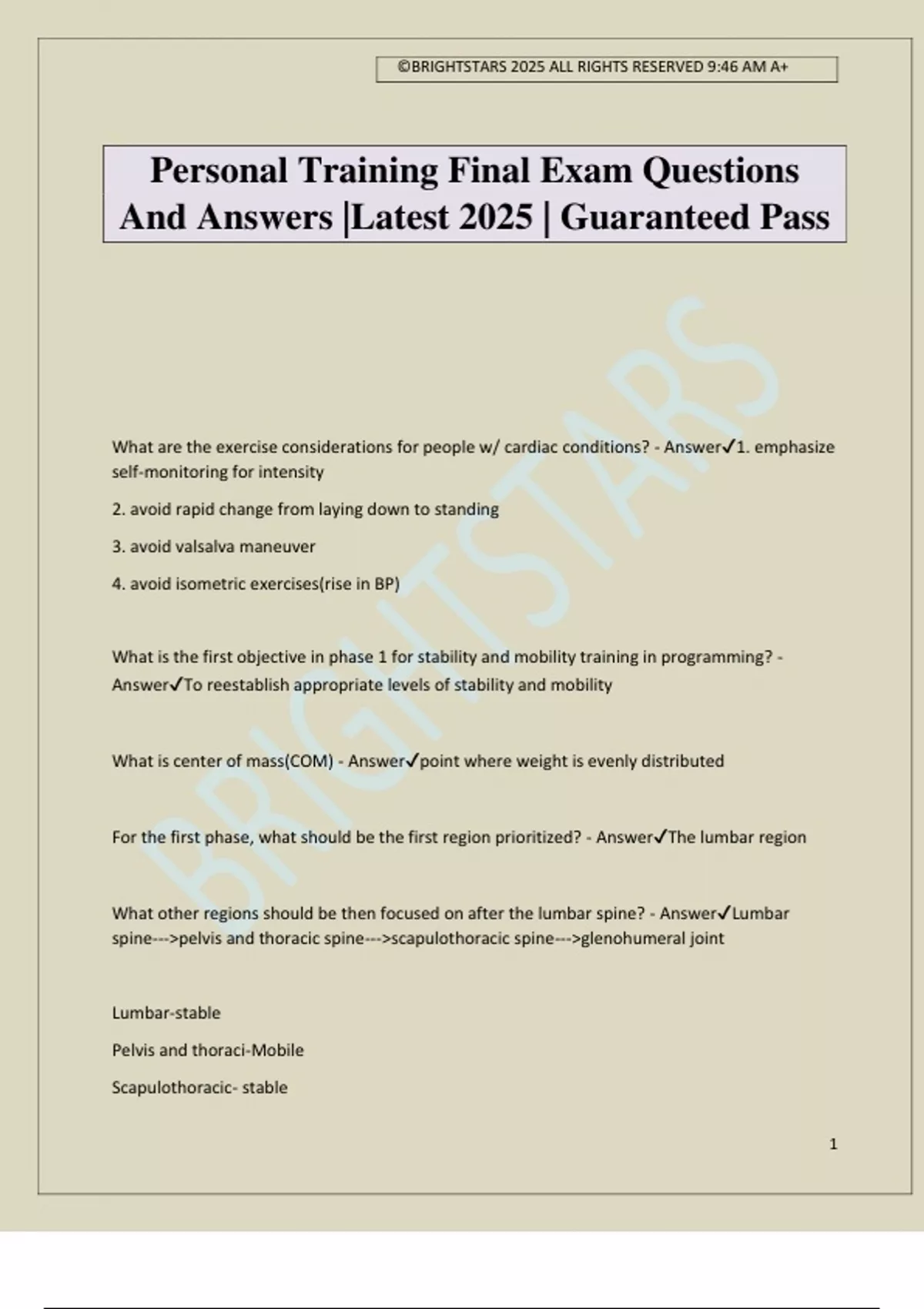 ©BRIGHTSTARS 2025 ALL RIGHTS RESERVED 9:46 AM A+ 1 Personal Training Final Exam Questions And Answers |Latest 2025 | Guaranteed Pass What are the exercise considerations for people w/ cardiac conditions? - Answer1. emphasize self-monitoring for intensity 2. avoid rapid change from laying down to standing 3. avoid valsalva maneuver 4. avoid isometric exercises(rise in BP) What is the first objective in phase 1 for stability and mobility training in programming? - AnswerTo reestablish appropriate levels of stability and mobility What is center of mass(COM) - Answerpoint where weight is evenly distributed For the first phase, what should be the first region prioritized? - AnswerThe lumbar region What other regions should be then focused on after the lumbar spine? - AnswerLumbar spine--->pelvis and thoracic spine--->scapulothoracic spine--->glenohumeral joint Lumbar-stable Pelvis and thoraci-Mobile Scapulothoracic- stable ©BRIGHTSTARS 2025 ALL RIGHTS RESERVED 9:46 AM A+ 2 Glenohumeral-Mobile Then DISTAL regions What is the importance of improving the three regions first before going to distal regions? - AnswerCompromises existing stability; when a joint lacks stability, many muscles normally mobilize that joint may need to alter their true functions to provide stability which leads to increase the potential for dysfunctional movement and injury Type 1 muscles - Answerstability Type 2 muscles - Answermobility What is self-myofascial release? - Answerstretching of the muscle with a foam roller What exercises make up the proximal stability: core function for lumbar area? - Answer1. Supine drawing in 2. Quadruped Drawing-in with extremity movement mobility or stability? glenohumeral - Answermobility mobility or stability? scapulothoracic - Answerstability mobility or stability? thoracic spine - Answermobility mobility or stability? lumbar spine - Answerstability mobility or stability? hip - Answermobility ©BRIGHTSTARS 2025 ALL RIGHTS RESERVED 9:46 AM A+ 3 mobility or stability? knee - Answerstability mobility or stability? ankle - Answermobility mobility or stability? foot - Answerstability As the agonist muscle shortens, what does the antagonist muscle do? - Answerlengthen What is a sarcomere? - Answerthe basic functioning unit of the myofibril that contains the contractile proteins that generate skeletal muscle movements What is myofibril? - Answerportion of muscle that gives the striated appearance to skeletal muscle How is a neutral pelvis achieved? - Answerby opposing force couples between 4 muscle groups In neutral pelvis, rectus abdominis is opposite of - Answerhip flexors In neutral pelvis, hamstrings are opposite of - Answererector spinae At the glenhumeral joint, what is a force-couple? - Answerdeltoid and rotator cuff muscles during abduction What is reciprocal inhibition? - Answerwhen hypertonic muscles decrease the neural drive to the opposing muscle
