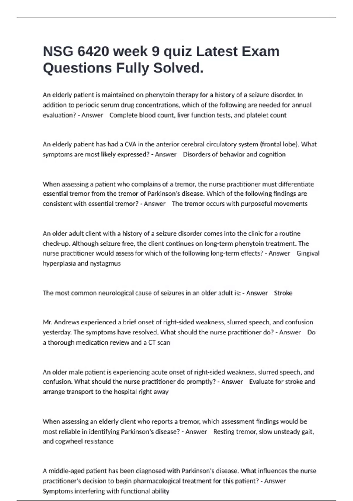 NSG 6420 week 9 quiz Latest Exam Questions Fully Solved.
