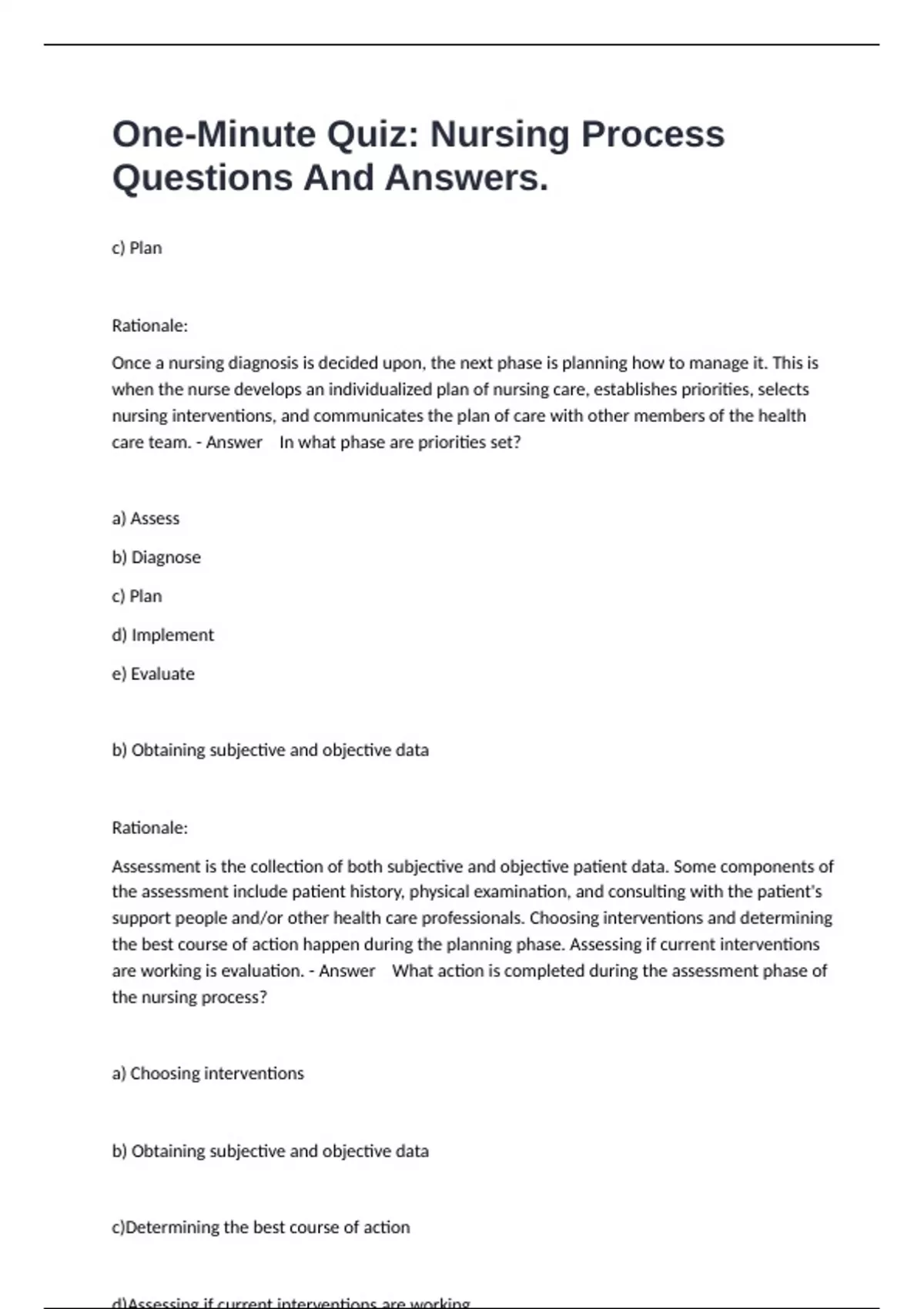 c) Plan Rationale: Once a nursing diagnosis is decided upon, the next phase is planning how to manage it. This is when the nurse develops an individualized plan of nursing care, establishes priorities, selects nursing interventions, and communicates the plan of care with other members of the health care team. - Answer In what phase are priorities set? a) Assess b) Diagnose c) Plan d) Implement e) Evaluate b) Obtaining subjective and objective data Rationale: Assessment is the collection of both subjective and objective patient data. Some components of the assessment include patient history, physical examination, and consulting with the patient's support people and/or other health care professionals. Choosing interventions and determining the best course of action happen during the planning phase. Assessing if current interventions are working is evaluation. - Answer What action is completed during the assessment phase of the nursing process? a) Choosing interventions b) Obtaining subjective and objective data c)Determining the best course of action d)Assessing if current interventions are working d) Implement