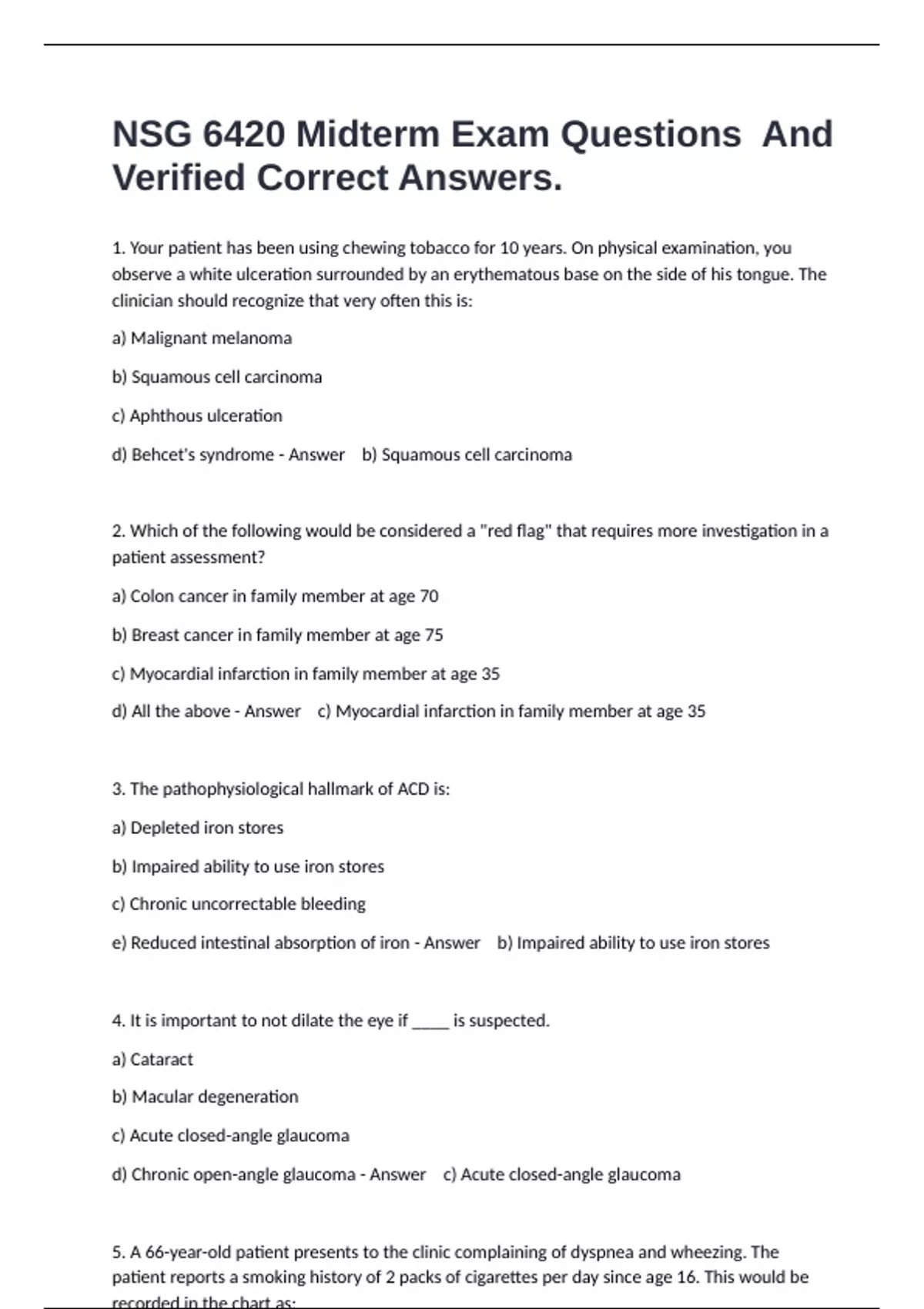 1. Your patient has been using chewing tobacco for 10 years. On physical examination, you observe a white ulceration surrounded by an erythematous base on the side of his tongue. The clinician should recognize that very often this is: a) Malignant melanoma b) Squamous cell carcinoma c) Aphthous ulceration d) Behcet's syndrome - Answer b) Squamous cell carcinoma 2. Which of the following would be considered a "red flag" that requires more investigation in a patient assessment? a) Colon cancer in family member at age 70 b) Breast cancer in family member at age 75 c) Myocardial infarction in family member at age 35 d) All the above - Answer c) Myocardial infarction in family member at age 35 3. The pathophysiological hallmark of ACD is: a) Depleted iron stores b) Impaired ability to use iron stores c) Chronic uncorrectable bleeding e) Reduced intestinal absorption of iron - Answer b) Impaired ability to use iron stores 4. It is important to not dilate the eye if ____ is suspected. a) Cataract b) Macular degeneration c) Acute closed-angle glaucoma d) Chronic open-angle glaucoma - Answer c) Acute closed-angle glaucoma 5. A 66-year-old patient presents to the clinic complaining of dyspnea and wheezing. The patient reports a smoking history of 2 packs of cigarettes per day since age 16. This would be recorded in the chart as: a) 50 x 2-pack years b) 100-pack years c) 50-year, 2-pack history
