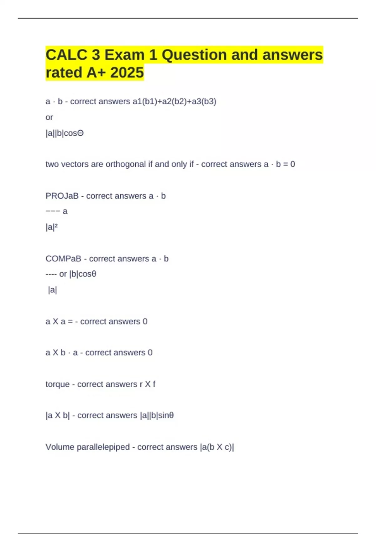 CALC 3 Exam 1 Question and answers rated A+ 2025 a · b - correct answers a1(b1)+a2(b2)+a3(b3) or |a||b|cosΘ two vectors are orthogonal if and only if - correct answers a · b = 0 PROJaB - correct answers a · b −−− a |a|² COMPaB - correct answers a · b ---- or |b|cosθ |a| a X a = - correct answers 0 a X b · a - correct answers 0 torque - correct answers r X f |a X b| - correct answers |a||b|sinθ