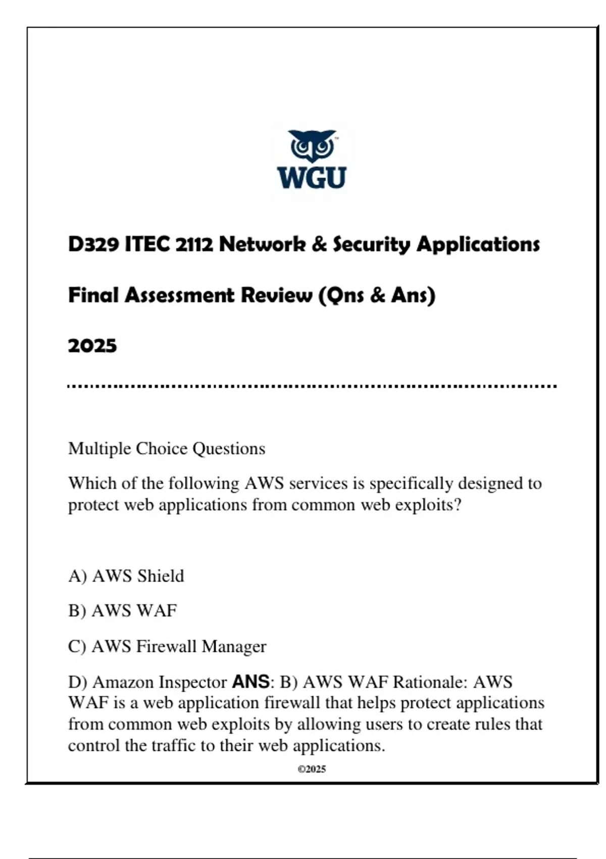 D) Amazon Inspector ANS: B) AWS WAF Rationale: AWS