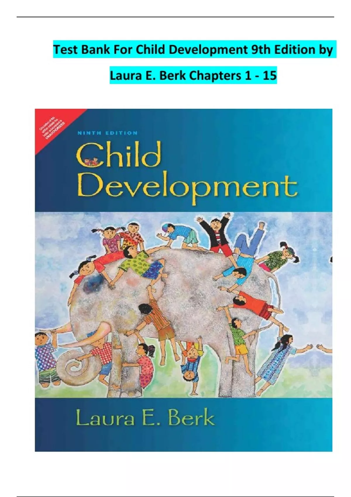 Test Bank For Child Development 9th Edition by Laura E. Berk Chapters 1 - 15 Table of Contents Part I: Theory and Research in Child Development Chapter 1 History, Theory, and Applied Directions Chapter 2 Research Strategies Part II: Foundations of Development Chapter 3 Biological Foundations, Prenatal Development, and Birth Chapter 4 Infancy: Early Learning, Motor Skills, and Perceptual Capacities Chapter 5 Physical Growth Part III: Cognitive and Language Development Chapter 6 Cognitive Development: Piagetian, Core Knowledge, and Vygotskian Perspectives Chapter 7 Cognitive Development: An Information-Processing Perspective Chapter 8 Intelligence Chapter 9 Language Development Part IV: Personality and Social Development Chapter 10 Emotional Development Chapter 11 Self and Social Understanding Chapter 12 Moral Development Chapter 13 Development of Sex Differences and Gender Roles Part V: Contextsfor Development Chapter 14 The Family Chapter 15 Peers, Media, and Schooling
