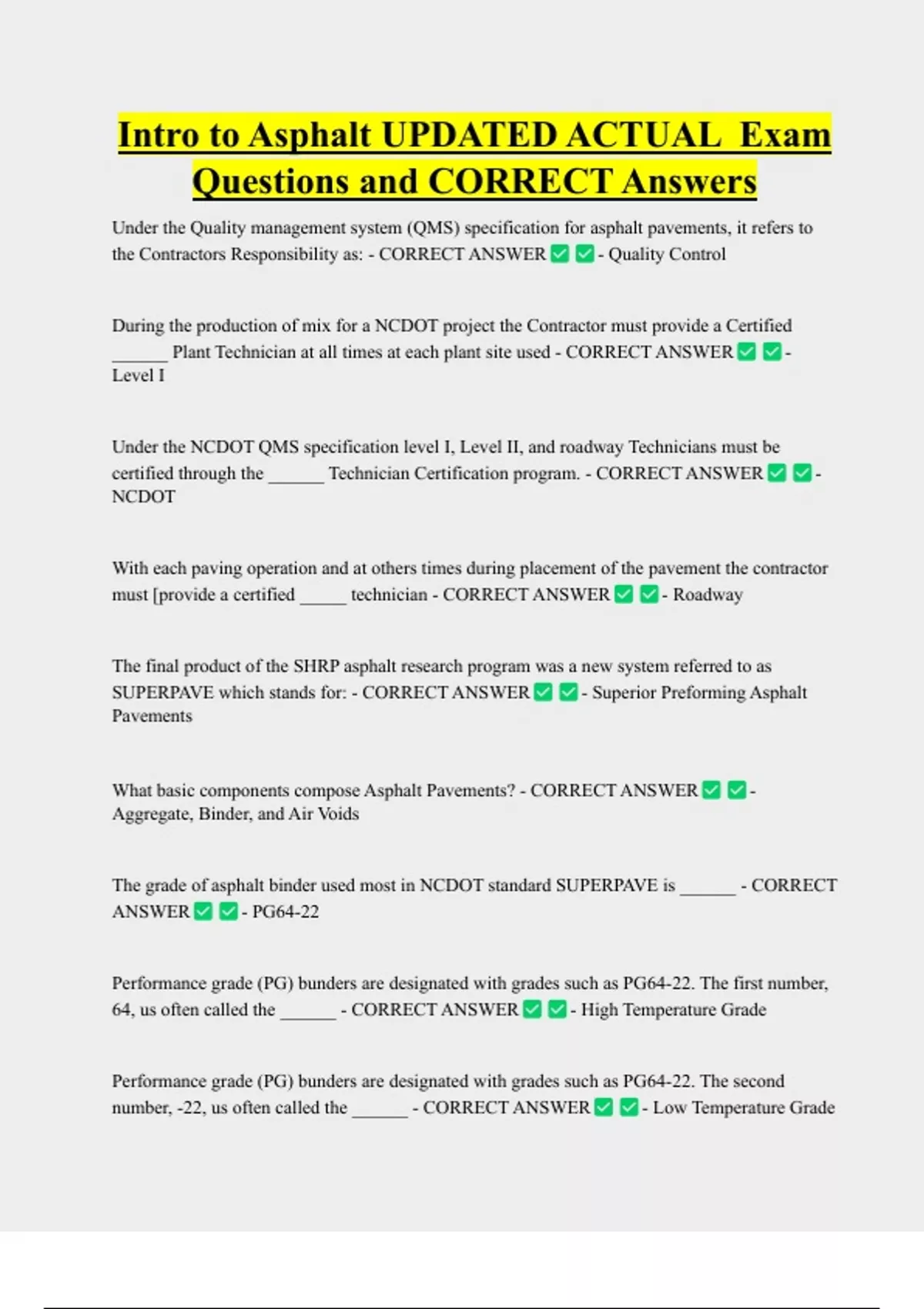 Intro to Asphalt UPDATED ACTUAL Exam Questions and CORRECT Answers Under the Quality management system (QMS) specification for asphalt pavements, it refers to the Contractors Responsibility as: - CORRECT ANSWER - Quality Control During the production of mix for a NCDOT project the Contractor must provide a Certified ______ Plant Technician at all times at each plant site used - CORRECT ANSWER Level