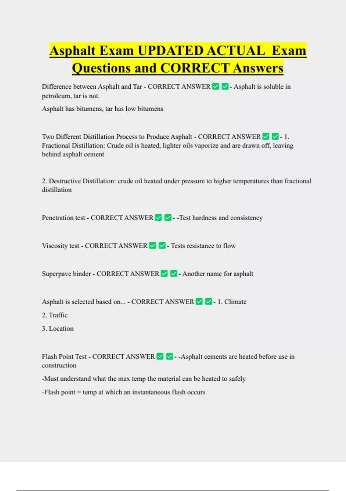 Asphalt Exam UPDATED ACTUAL Exam Questions and CORRECT Answers Difference between Asphalt and Tar - CORRECT ANSWER petroleum, tar is not. Asphalt has bitumens, tar has low bitumens - Asphalt is soluble in Two Different Distillation Process to Produce Asphalt - CORRECT ANSWER - 1. Fractional Distillation: Crude oil is heated, lighter oils vaporize and are drawn off, leaving behind asphalt cement