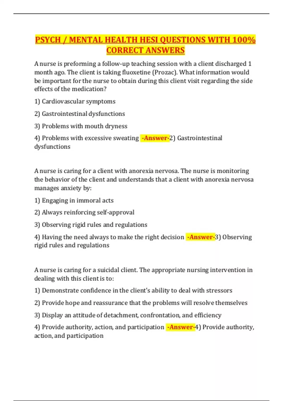 PSYCH / MENTAL HEALTH HESI QUESTIONS WITH 100%