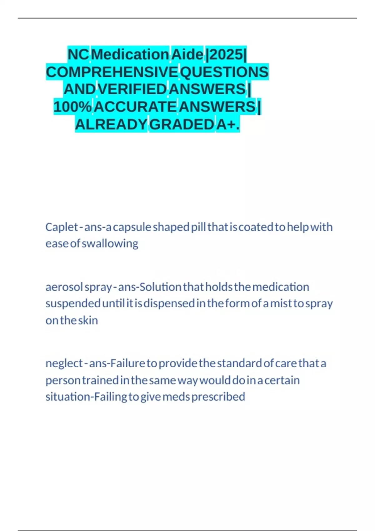 NC Medication Aide |2025|COMPREHENSIVE QUESTIONS AND VERIFIED ANSWERS |100% ACCURATE ANSWERS | ALREADY GRADED A+ NC Medication Aide |2025|COMPREHENSIVE QUESTIONS AND VERIFIED ANSWERS |100% ACCURATE ANSWERS | ALREADY GRADED A+ NC Medication Aide |2025|COMPREHENSIVE QUESTIONS AND VERIFIED ANSWERS |100% ACCURATE ANSWERS | ALREADY GRADED A+ NC Medication Aide |2025|COMPREHENSIVE QUESTIONS AND VERIFIED ANSWERS |100% ACCURATE ANSWERS | ALREADY GRADED A+ NC Medication Aide |2025|COMPREHENSIVE QUESTIONS AND VERIFIED ANSWERS |100% ACCURATE ANSWERS | ALREADY GRADED A+ NC Medication Aide |2025|COMPREHENSIVE QUESTIONS AND VERIFIED ANSWERS |100% ACCURATE ANSWERS | ALREADY GRADED A+ NC Medication Aide |2025|COMPREHENSIVE QUESTIONS AND VERIFIED ANSWERS |100% ACCURATE ANSWERS | ALREADY GRADED A+ NC Medication Aide |2025|COMPREHENSIVE QUESTIONS AND VERIFIED ANSWERS |100% ACCURATE ANSWERS | ALREADY GRADED A+ NC Medication Aide |2025|COMPREHENSIVE QUESTIONS AND VERIFIED ANSWERS |100% ACCURATE ANSWERS | ALREADY GRADED A+ NC Medication Aide |2025|COMPREHENSIVE QUESTIONS AND VERIFIED ANSWERS |100% ACCURATE ANSWERS | ALREADY GRADED A+ NC Medication Aide |2025|COMPREHENSIVE QUESTIONS AND VERIFIED ANSWERS |100% ACCURATE ANSWERS | ALREADY GRADED A+ NC Medication Aide |2025|COMPREHENSIVE QUESTIONS AND VERIFIED ANSWERS |100% ACCURATE ANSWERS | ALREADY GRADED A+ NC Medication Aide |2025|COMPREHENSIVE QUESTIONS AND VERIFIED ANSWERS |100% ACCURATE ANSWERS | ALREADY GRADED A+ NC Medication Aide |2025|COMPREHENSIVE QUESTIONS AND VERIFIED ANSWERS |100% ACCURATE ANSWERS | ALREADY GRADED A+ NC Medication Aide |2025|COMPREHENSIVE QUESTIONS AND VERIFIED ANSWERS |100% ACCURATE ANSWERS | ALREADY GRADED A+ NC Medication Aide |2025|COMPREHENSIVE QUESTIONS AND VERIFIED ANSWERS |100% ACCURATE ANSWERS | ALREADY GRADED A+ NC Medication Aide |2025|COMPREHENSIVE QUESTIONS AND VERIFIED ANSWERS |100% ACCURATE ANSWERS | ALREADY GRADED A+ NC Medication Aide |2025|COMPREHENSIVE QUESTIONS AND VERIFIED ANSWERS |100% ACCURATE ANSWERS | ALREADY GRADED A+ NC Medication Aide |2025|COMPREHENSIVE QUESTIONS AND VERIFIED ANSWERS |100% ACCURATE ANSWERS | ALREADY GRADED A+ NC Medication Aide |2025|COMPREHENSIVE QUESTIONS AND VERIFIED ANSWERS |100% ACCURATE ANSWERS | ALREADY GRADED A+ NC Medication Aide |2025|COMPREHENSIVE QUESTIONS AND VERIFIED ANSWERS |100% ACCURATE ANSWERS | ALREADY GRADED A+ NC Medication Aide |2025|COMPREHENSIVE QUESTIONS AND VERIFIED ANSWERS |100% ACCURATE ANSWERS | ALREADY GRADED A+ NC Medication Aide |2025|COMPREHENSIVE QUESTIONS AND VERIFIED ANSWERS |100% ACCURATE ANSWERS | ALREADY GRADED A+ NC Medication Aide |2025|COMPREHENSIVE QUESTIONS AND VERIFIED ANSWERS |100% ACCURATE ANSWERS | ALREADY GRADED A+ NC Medication Aide |2025|COMPREHENSIVE QUESTIONS AND VERIFIED ANSWERS |100% ACCURATE ANSWERS | ALREADY GRADED A+ NC Medication Aide |2025|COMPREHENSIVE QUESTIONS AND VERIFIED ANSWERS |100% ACCURATE ANSWERS | ALREADY GRADED A+ NC Medication Aide |2025|COMPREHENSIVE QUESTIONS AND VERIFIED ANSWERS |100% ACCURATE ANSWERS | ALREADY GRADED A+ NC Medication Aide |2025|COMPREHENSIVE QUESTIONS AND VERIFIED ANSWERS |100% ACCURATE ANSWERS | ALREADY GRADED A+ NC Medication Aide |2025|COMPREHENSIVE QUESTIONS AND VERIFIED ANSWERS |100% ACCURATE ANSWERS | ALREADY GRADED A+ NC Medication Aide |2025|COMPREHENSIVE QUESTIONS AND VERIFIED ANSWERS |100% ACCURATE ANSWERS | ALREADY GRADED A+ NC Medication Aide |2025|COMPREHENSIVE QUESTIONS AND VERIFIED ANSWERS |100% ACCURATE ANSWERS | ALREADY GRADED A+ NC Medication Aide |2025|COMPREHENSIVE QUESTIONS AND VERIFIED ANSWERS |100% ACCURATE ANSWERS | ALREADY GRADED A+ NC Medication Aide |2025|COMPREHENSIVE QUESTIONS AND VERIFIED ANSWERS |100% ACCURATE ANSWERS | ALREADY GRADED A+ NC Medication Aide |2025|COMPREHENSIVE QUESTIONS AND VERIFIED ANSWERS |100% ACCURATE ANSWERS | ALREADY GRADED A+ NC Medication Aide |2025|COMPREHENSIVE QUESTIONS AND VERIFIED ANSWERS |100% ACCURATE ANSWERS | ALREADY GRADED A+ NC Medication Aide |2025|COMPREHENSIVE QUESTIONS AND VERIFIED ANSWERS |100% ACCURATE ANSWERS | ALREADY GRADED A+ NC Medication Aide |2025|COMPREHENSIVE QUESTIONS AND VERIFIED ANSWERS |100% ACCURATE ANSWERS | ALREADY GRADED A+