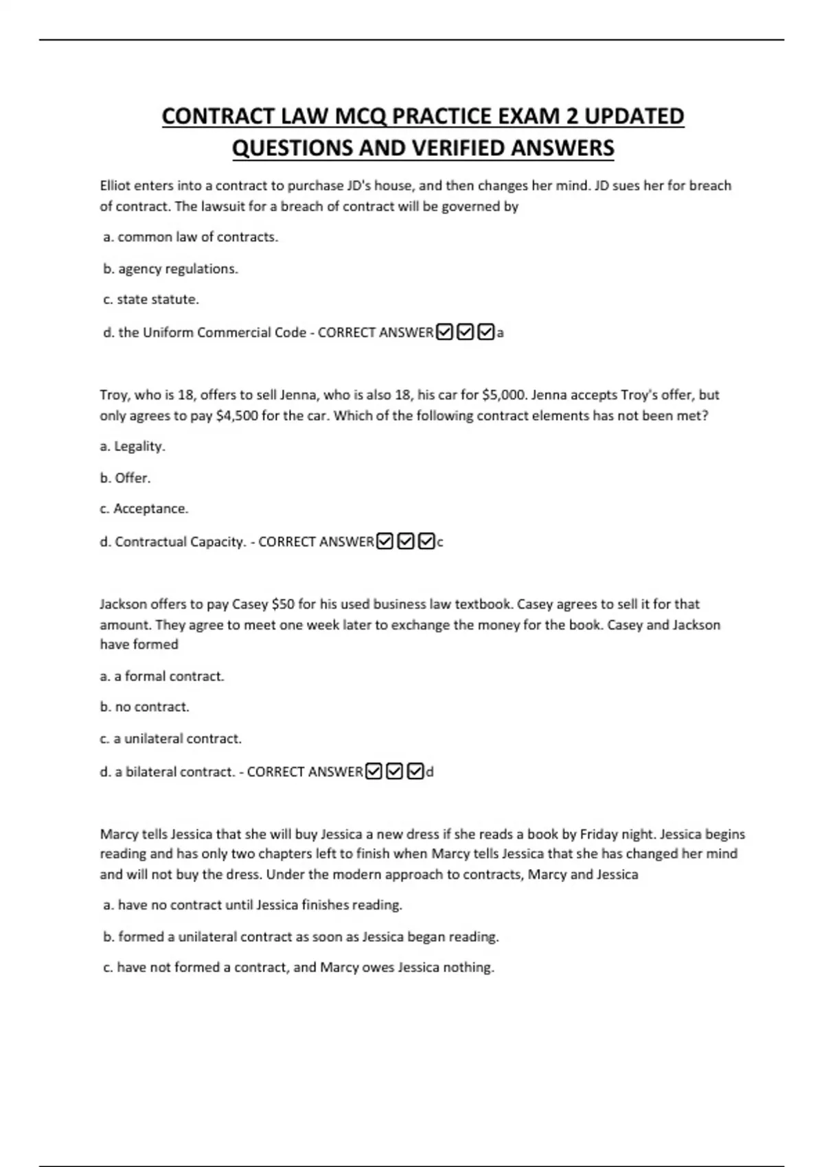 CONTRACT LAW MCQ PRACTICE EXAM 2 UPDATED QUESTIONS AND VERIFIED ANSWERS