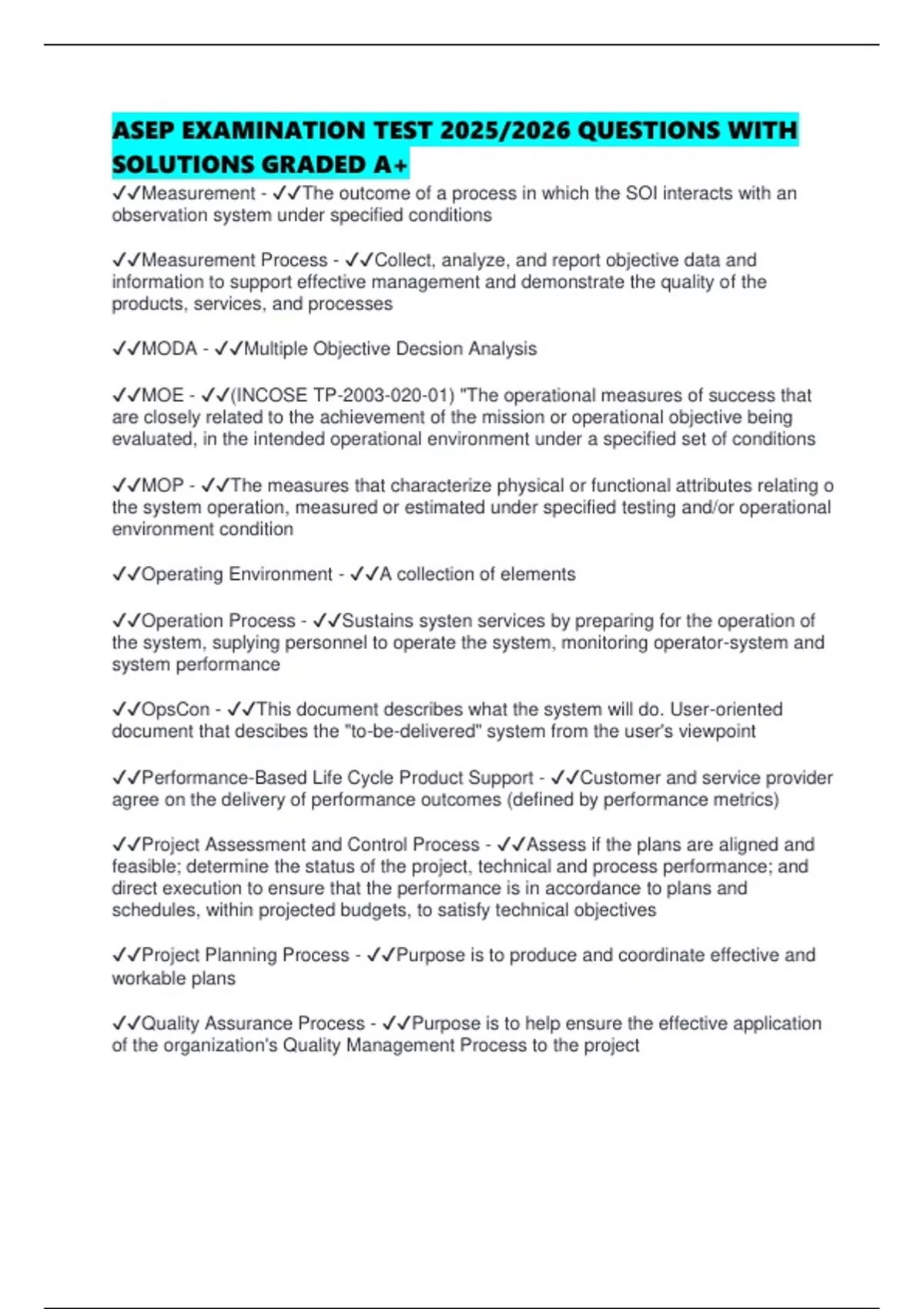 ASEP EXAMINATION TEST 2025/2026 QUESTIONS WITH SOLUTIONS GRADED A+ Measurement - The outcome of a process in which the SOI interacts with an observation system under specified conditions Measurement Process - Collect, analyze, and report objective data and information to support effective management and demonstrate the quality of the products, services, and processes MODA - Multiple Objective Decsion Analysis MOE - (INCOSE TP-) "The operational measures of success that are closely related to the achievement of the mission or operational objective being evaluated, in the intended operational environment under a specified set of conditions MOP - The measures that characterize physical or functional attributes relating o the system operation, measured or estimated under specified testing and/or operational environment condition