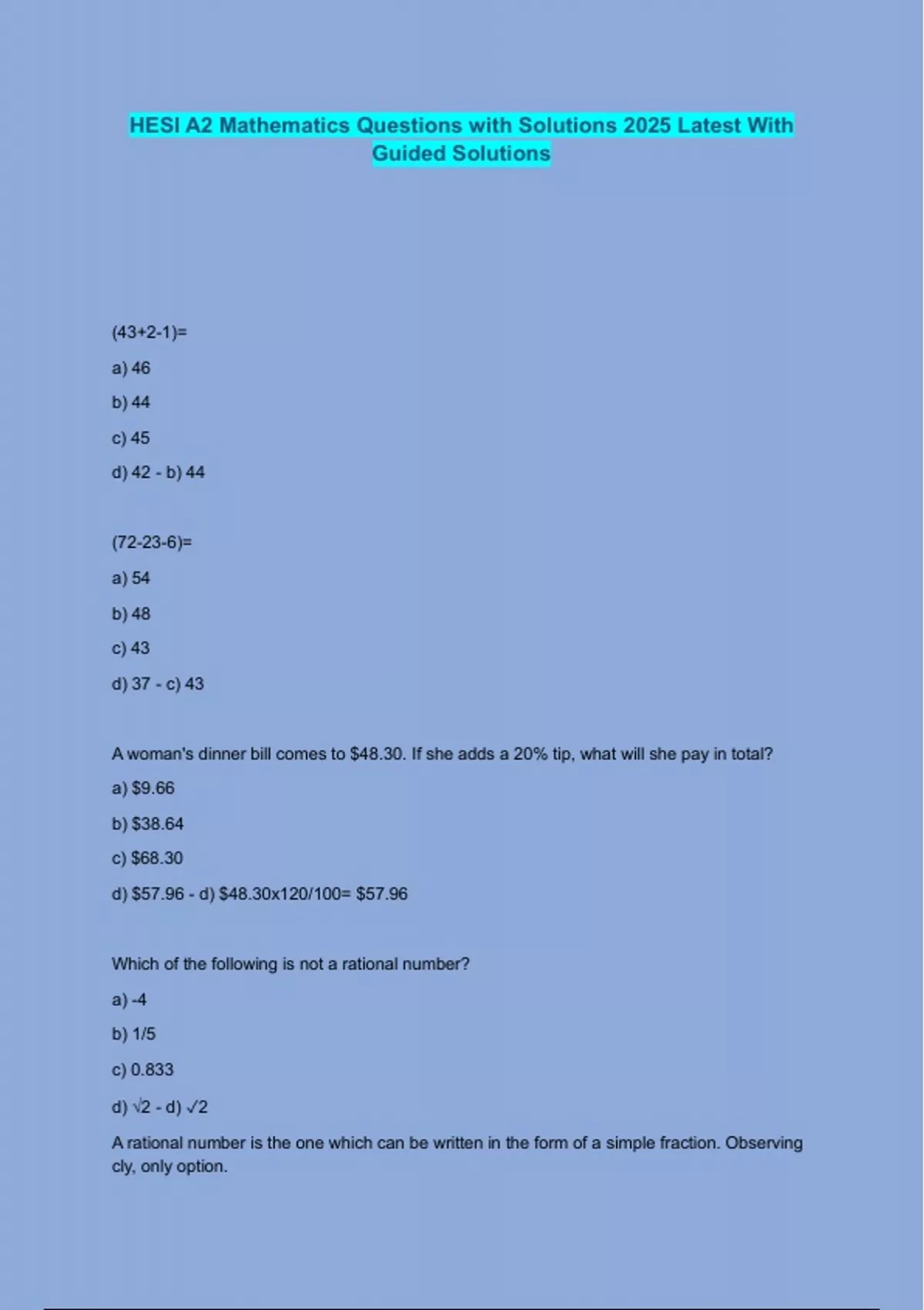HESI A2 Mathematics Questions with Solutions 2025 Latest With