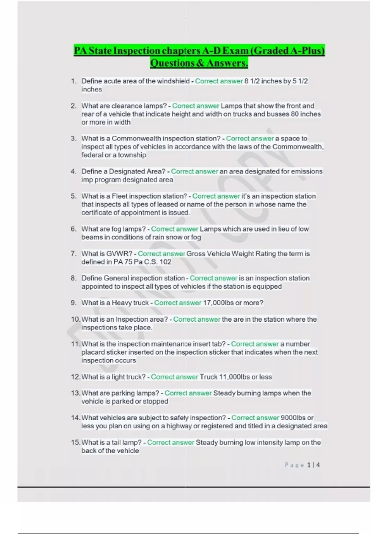 1. Define acute area of the windshield - Correct answer 8 1/2 inches by 5 1/2 inches 2. What are clearance lamps? - Correct answer Lamps that show the front and rear of a vehicle that indicate height and width on trucks and busses 80 inches or more in width 3. What is a Commonwealth inspection station? - Correct answer a space to inspect all types of vehicles in accordance with the laws of the Commonwealth, federal or a township 4. Define a Designated Area? - Correct answer an area designated for emissions imp program designated area 5. What is a Fleet inspection station? - Correct answer it’s an inspection station that inspects all types of leased or name of the person in whose name the certificate