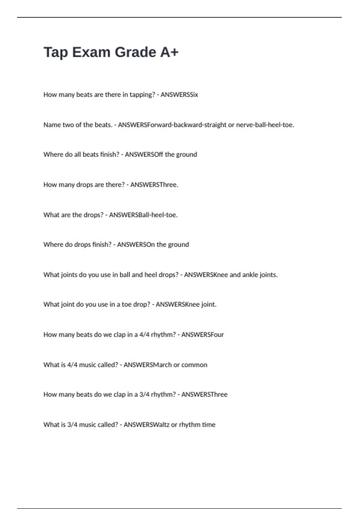 Tap Exam Grade A+ How many beats are there in tapping? - ANSWERSSix Name two of the beats. - ANSWERSForward-backward-straight or nerve-ball-heel-toe. Where do all beats finish? - ANSWERSOff the ground How many drops are there? - ANSWERSThree. What are the drops? - ANSWERSBall-heel-toe. Where do drops finish? - ANSWERSOn the ground What joints do you use in ball and heel drops? - ANSWERSKnee and ankle joints. What joint do you use in a toe drop? - ANSWERSKnee joint. How many beats do we clap in a 4/4 rhythm? - ANSWERSFour What is 4/4 music called? - ANSWERSMarch or common How many beats do we clap in a 3/4 rhythm? - ANSWERSThree What is 3/4 music called? - ANSWERSWaltz or rhythm time