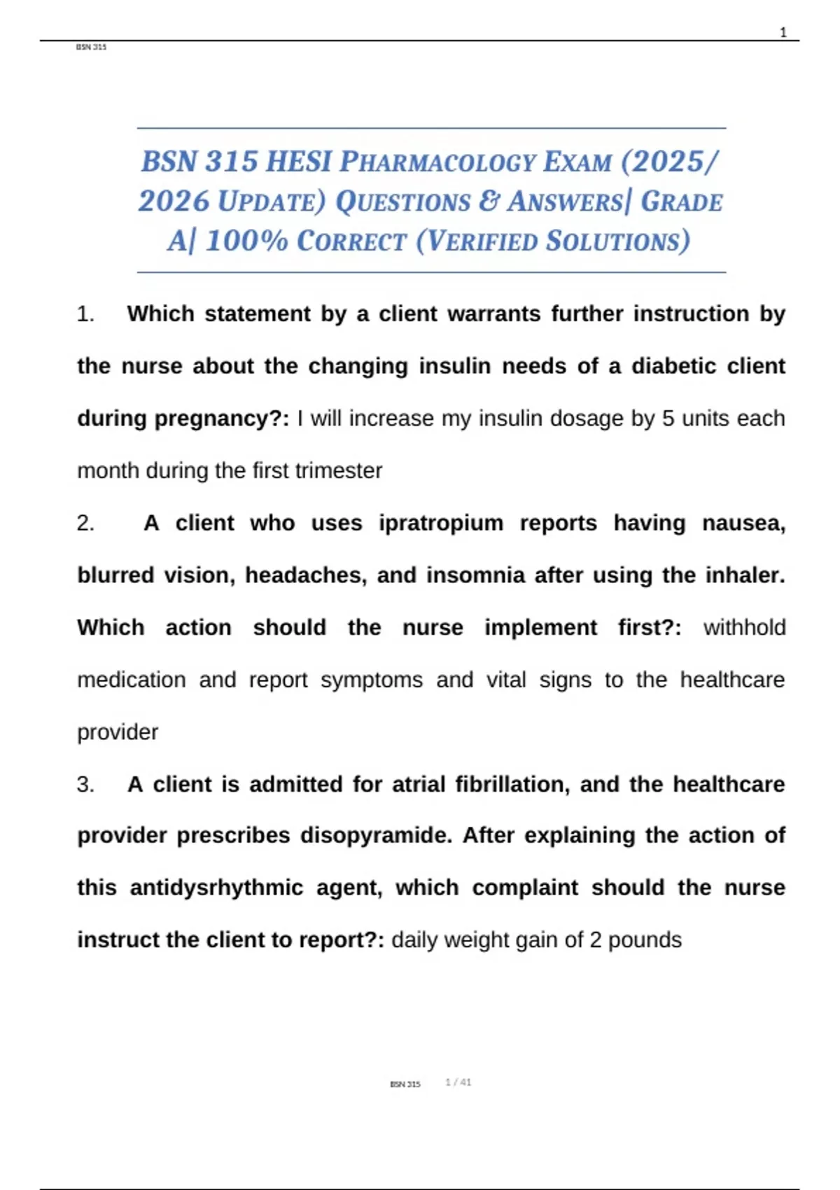 BSN 315 HESI PHARMACOLOGY EXAM (2025/