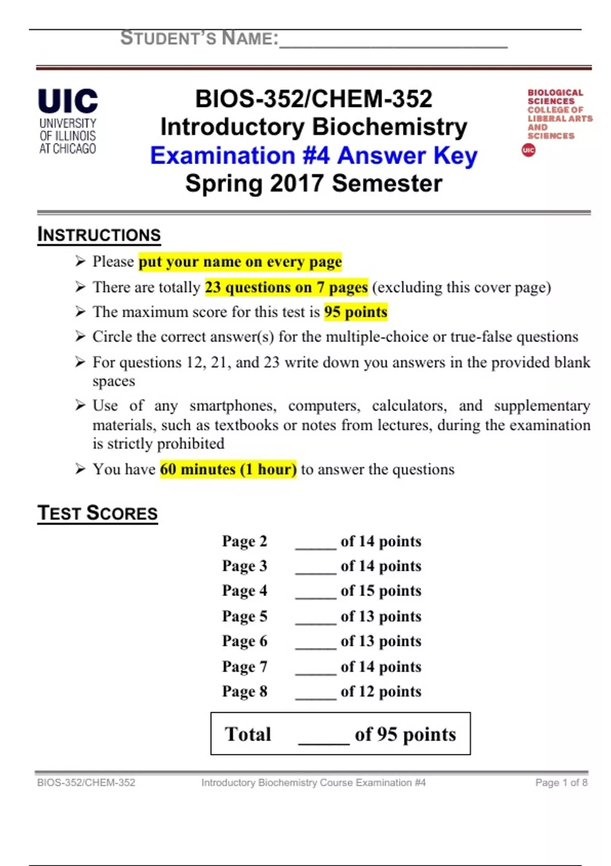 BIOS-352/CHEM-352 Introductory Biochemistry Course Examination #4 Page 1 of 8