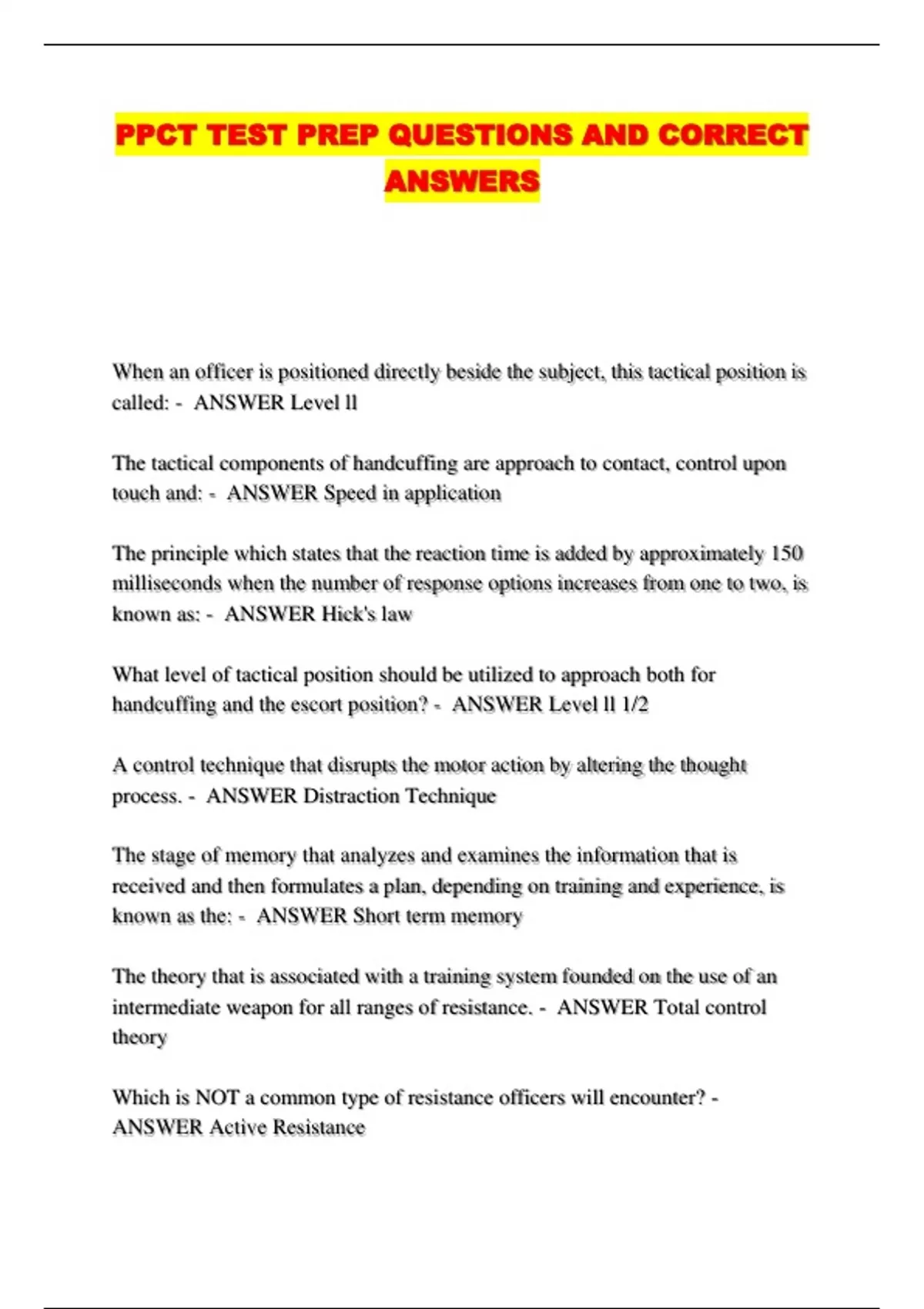 PPCT TEST PREP QUESTIONS AND CORRECT