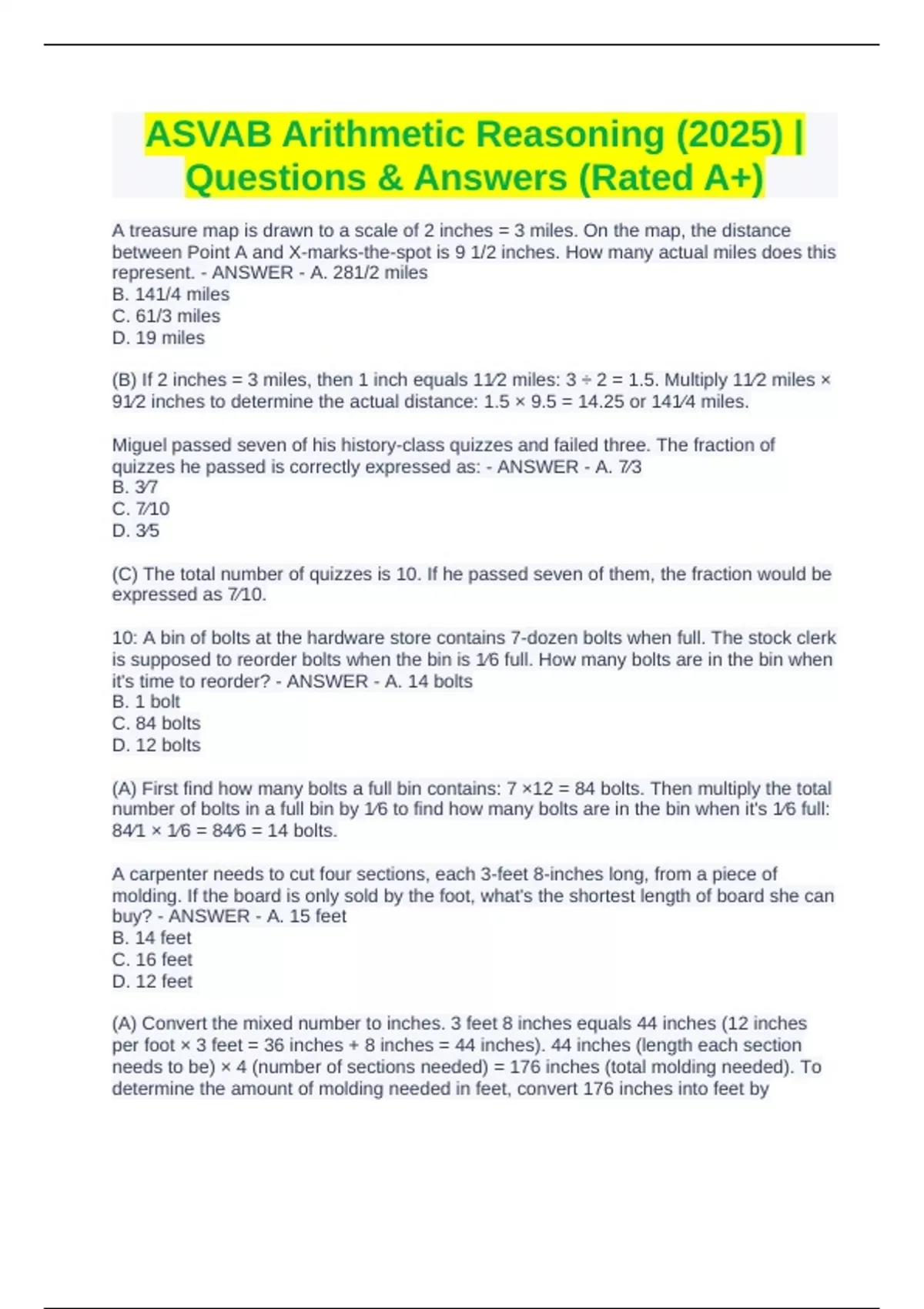 A treasure map is drawn to a scale of 2 inches = 3 miles. On the map, the distance between Point A and X-marks-the-spot is 9 1/2 inches. How many actual miles does this represent. - ANSWER - A. 281/2 miles B. 141/4 miles C. 61/3 miles D. 19 miles (B) If 2 inches = 3 miles, then 1 inch equals 11⁄2 miles: 3 ÷ 2 = 1.5. Multiply 11⁄2 miles × 91⁄2 inches to determine the actual distance: 1.5 × 9.5 = 14.25 or 141⁄4 miles. Miguel passed seven of his history-class quizzes and failed three. The fraction of quizzes he passed is correctly expressed as: - ANSWER - A. 7⁄3 B. 3⁄7 C. 7⁄10 D. 3⁄5 (C) The total number of quizzes is 10. If he passed seven of them, the fraction would be expressed as 7⁄10. 10: A bin of bolts at the hardware store contains 7-dozen bolts when full. The stock clerk is supposed to reorder bolts when the bin is 1⁄6 full. How many bolts are in the bin when it's time to reorder? - ANSWER - A. 14 bolts B. 1 bolt C. 84 bolts D. 12 bolts (A) First find how many bolts a full bin contains: 7 ×12 = 84 bolts. Then multiply the total number of bolts in a full bin by 1⁄6 to find how many bolts are in the bin when it's 1⁄6 full: 84⁄1 × 1⁄6 = 84⁄6 = 14 bolts.