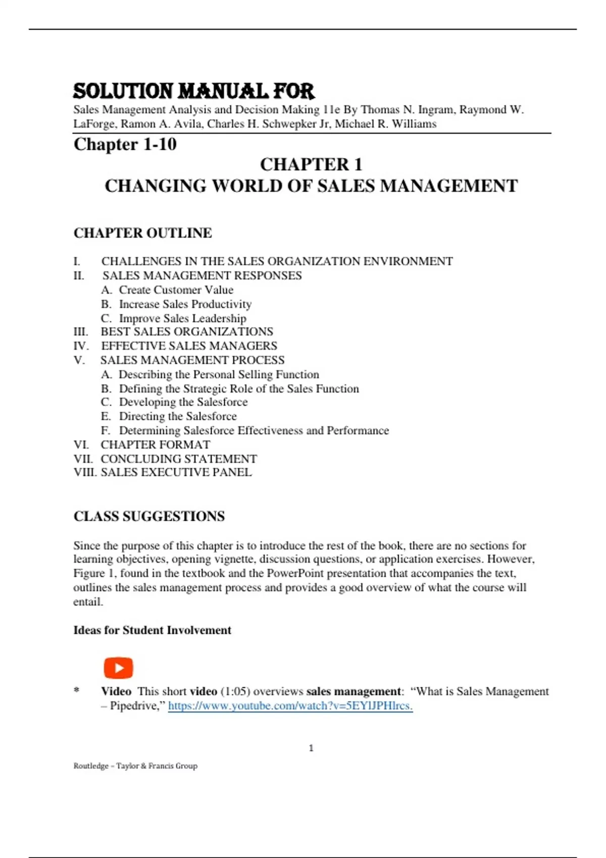 Solution Manual For Sales Management Analysis and Decision Making 11th Edition By Thomas N. Ingram, Raymond W. LaForge, Ramon A. Avila, Charles H. Schwepker Jr, Michael R. Williams
