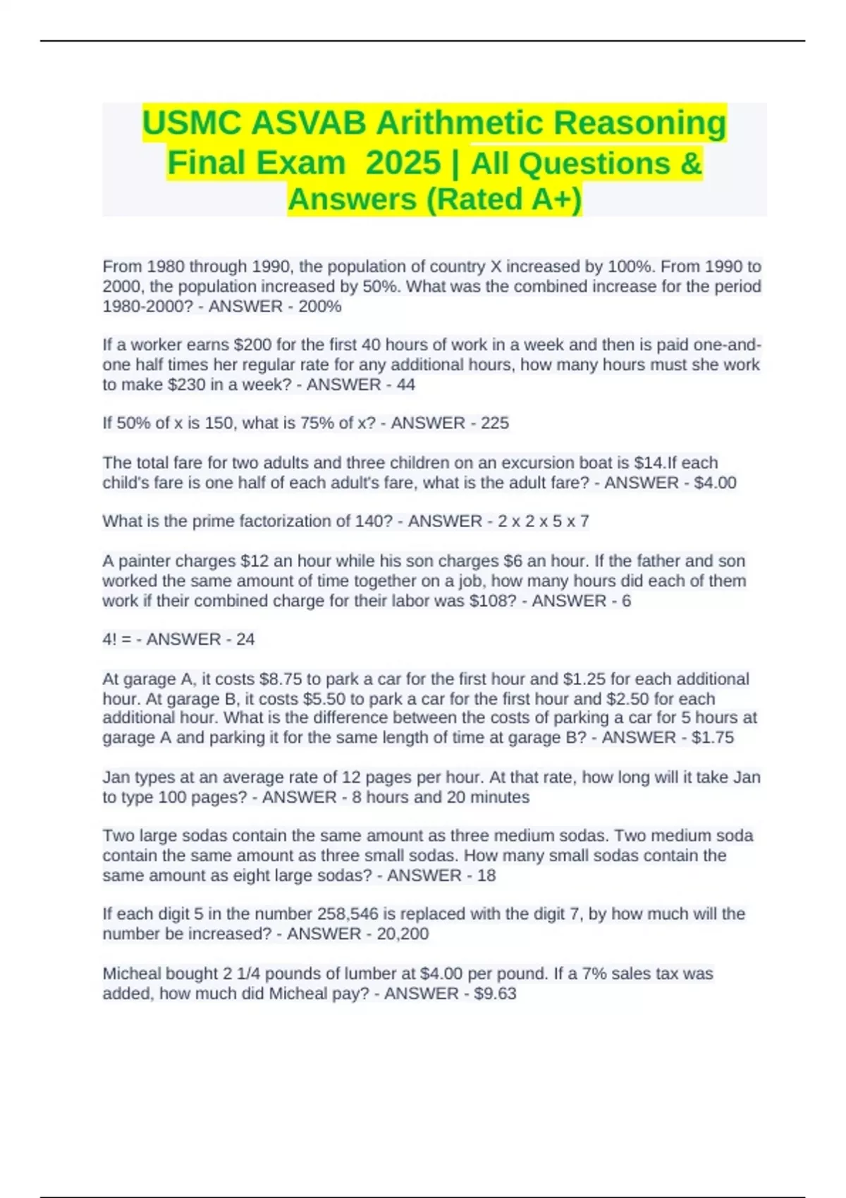 USMC ASVAB Arithmetic Reasoning Final Exam 2025 | All Questions & Answers (Rated A+)