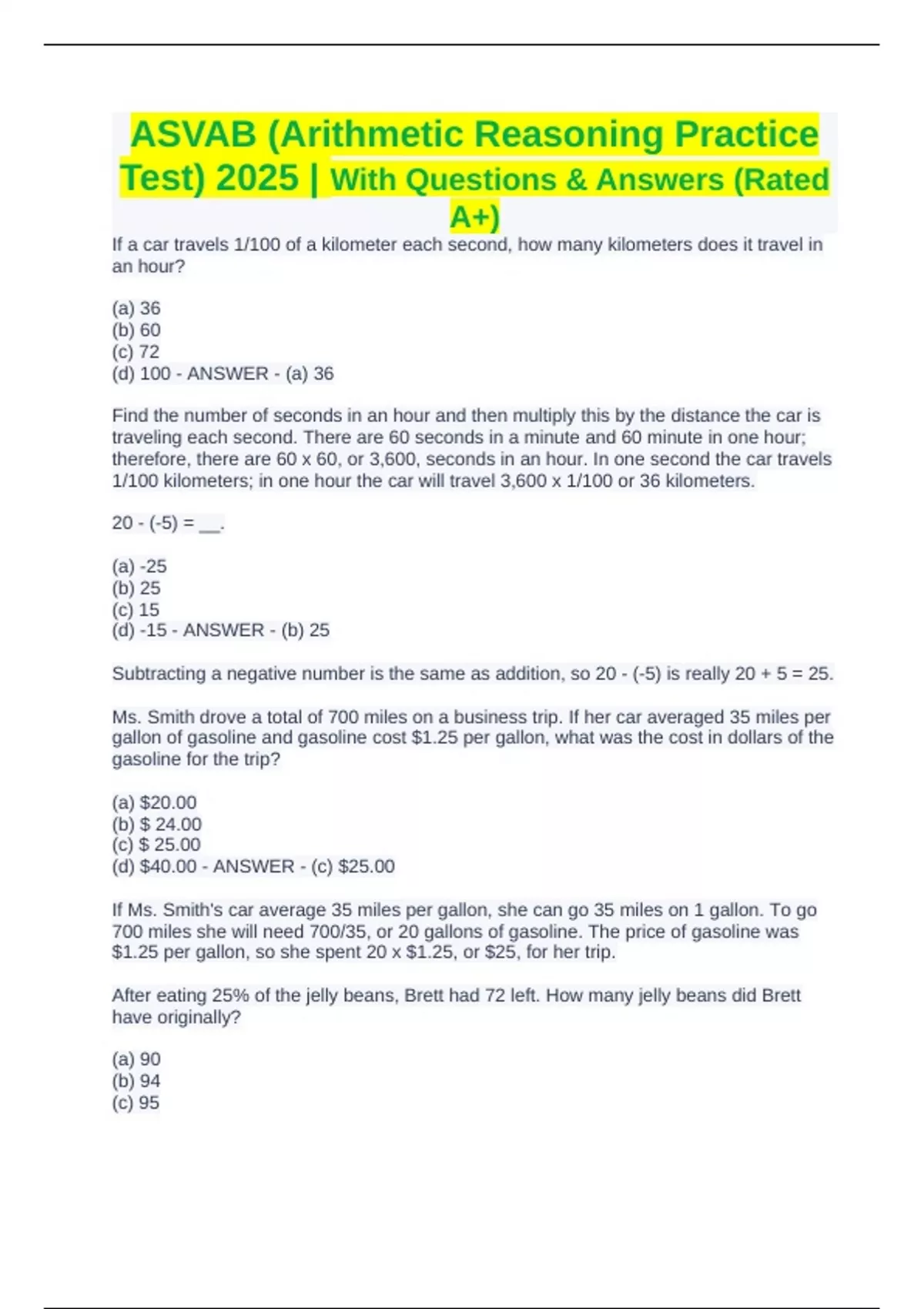 If a car travels 1/100 of a kilometer each second, how many kilometers does it travel in an hour? (a) 36 (b) 60 (c) 72 (d) 100 - ANSWER - (a) 36 Find the number of seconds in an hour and then multiply this by the distance the car is traveling each second. There are 60 seconds in a minute and 60 minute in one hour; therefore, there are 60 x 60, or 3,600, seconds in an hour. In one second the car travels 1/100 kilometers; in one hour the car will travel 3,600 x 1/100 or 36 kilometers. 20 - (-5) = __. (a) -25 (b) 25 (c) 15 (d) -15 - ANSWER - (b) 25 Subtracting a negative number is the same as addition, so 20 - (-5) is really 20 + 5 = 25. Ms. Smith drove a total of 700 miles on a business trip. If her car averaged 35 miles per gallon of gasoline and gasoline cost $1.25 per gallon, what was the cost in dollars of the gasoline for the trip? (a) $20.00 (b) $ 24.00 (c) $ 25.00 (d) $40.00 - ANSWER - (c) $25.00
