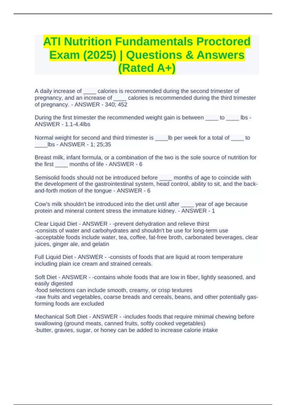 A daily increase of ____ calories is recommended during the second trimester of pregnancy, and an increase of ____ calories is recommended during the third trimester of pregnancy. - ANSWER - 340; 452 During the first trimester the recommended weight gain is between ____ to ____ lbs - ANSWER - 1.1-4.4lbs Normal weight for second and third trimester is ____lb per week for a total of ____ to ____lbs - ANSWER - 1; 25;35 Breast milk, infant formula, or a combination of the two is the sole source of nutrition for the first ____ months of life - ANSWER - 6 Semisolid foods should not be introduced before ____ months of age to coincide with the development of the gastrointestinal system, head control, ability to sit, and the back-and-forth motion of the tongue - ANSWER - 6 Cow's milk shouldn't be introduced into the diet until after ____ year of age because protein and mineral content stress the immature kidney. - ANSWER - 1 Clear Liquid Diet - ANSWER - -prevent dehydration and relieve thirst -consists of water and carbohydrates and shouldn't be use for long-term use -acceptable foods include water, tea, coffee, fat-free broth, carbonated beverages, clear juices, ginger ale, and gelatin Full Liquid Diet - ANSWER - -consists of foods that are liquid at room temperature including plain ice cream and strained cereals. Soft Diet - ANSWER - -contains whole foods that are low in fiber, lightly seasoned, and easily digested -food selections can include smooth, creamy, or crisp textures -raw fruits and vegetables, coarse breads and cereals, beans, and other potentially gas-forming foods are excluded