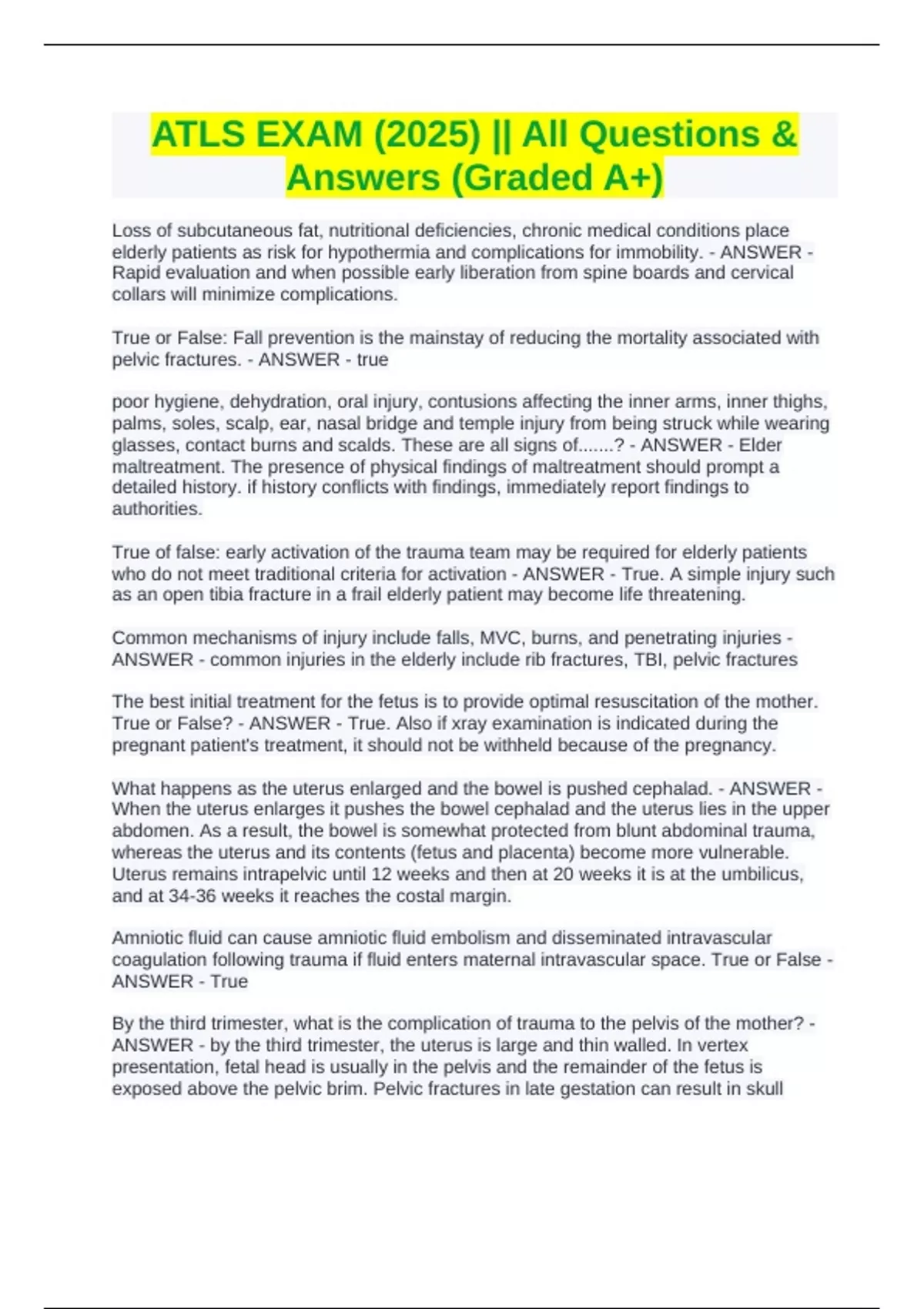 Loss of subcutaneous fat, nutritional deficiencies, chronic medical conditions place elderly patients as risk for hypothermia and complications for immobility. - ANSWER - Rapid evaluation and when possible early liberation from spine boards and cervical collars will minimize complications. True or False: Fall prevention is the mainstay of reducing the mortality associated with pelvic fractures. - ANSWER - true poor hygiene, dehydration, oral injury, contusions affecting the inner arms, inner thighs, palms, soles, scalp, ear, nasal bridge and temple injury from being struck while wearing glasses, contact burns and scalds. These are all signs of.......? - ANSWER - Elder maltreatment. The presence of physical findings of maltreatment should prompt a detailed history. if history conflicts with findings, immediately report findings to authorities. True of false: early activation of the trauma team may be required for elderly patients who do not meet traditional criteria for activation - ANSWER - True. A simple injury such as an open tibia fracture in a frail elderly patient may become life threatening. Common mechanisms of injury include falls, MVC, burns, and penetrating injuries - ANSWER - common injuries in the elderly include rib fractures, TBI, pelvic fractures The best initial treatment for the fetus is to provide optimal resuscitation of the mother. True or False? - ANSWER - True. Also if xray examination is indicated during the pregnant patient's treatment, it should not be withheld because of the pregnancy.