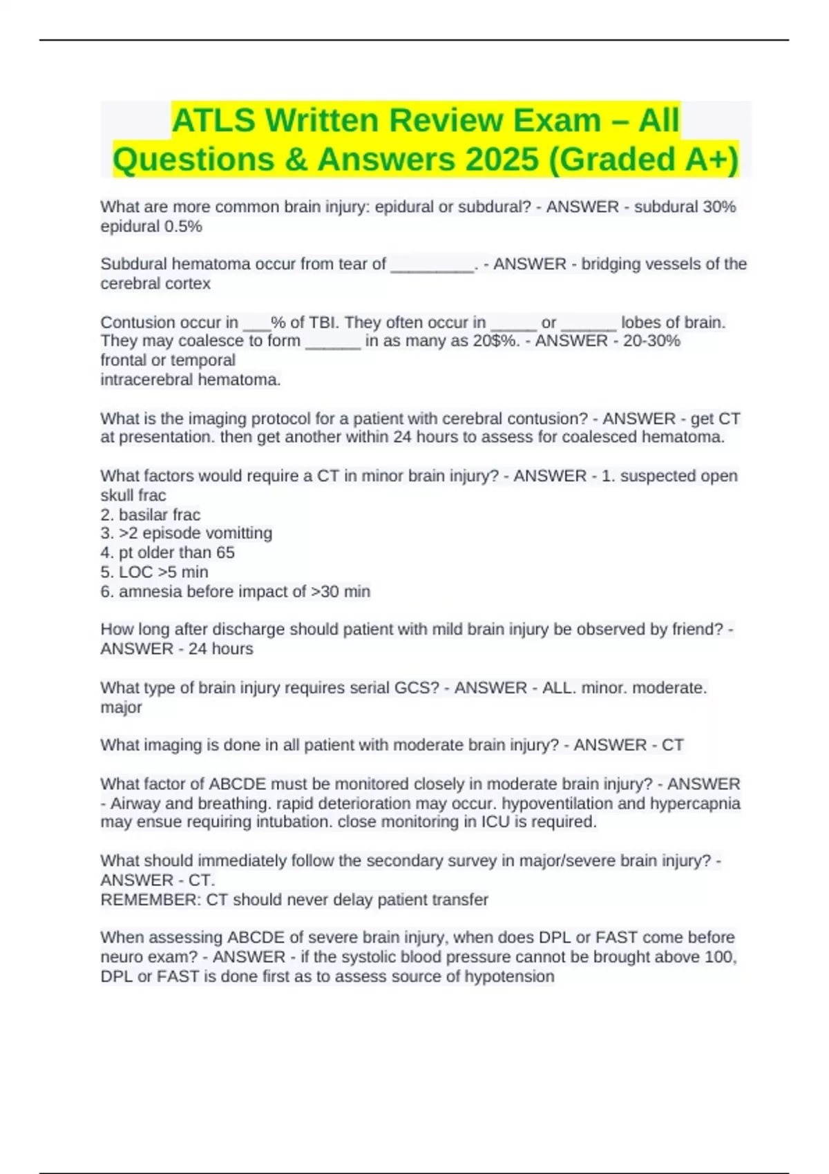 What type of brain injury requires serial GCS? - ANSWER - ALL. minor. moderate.
