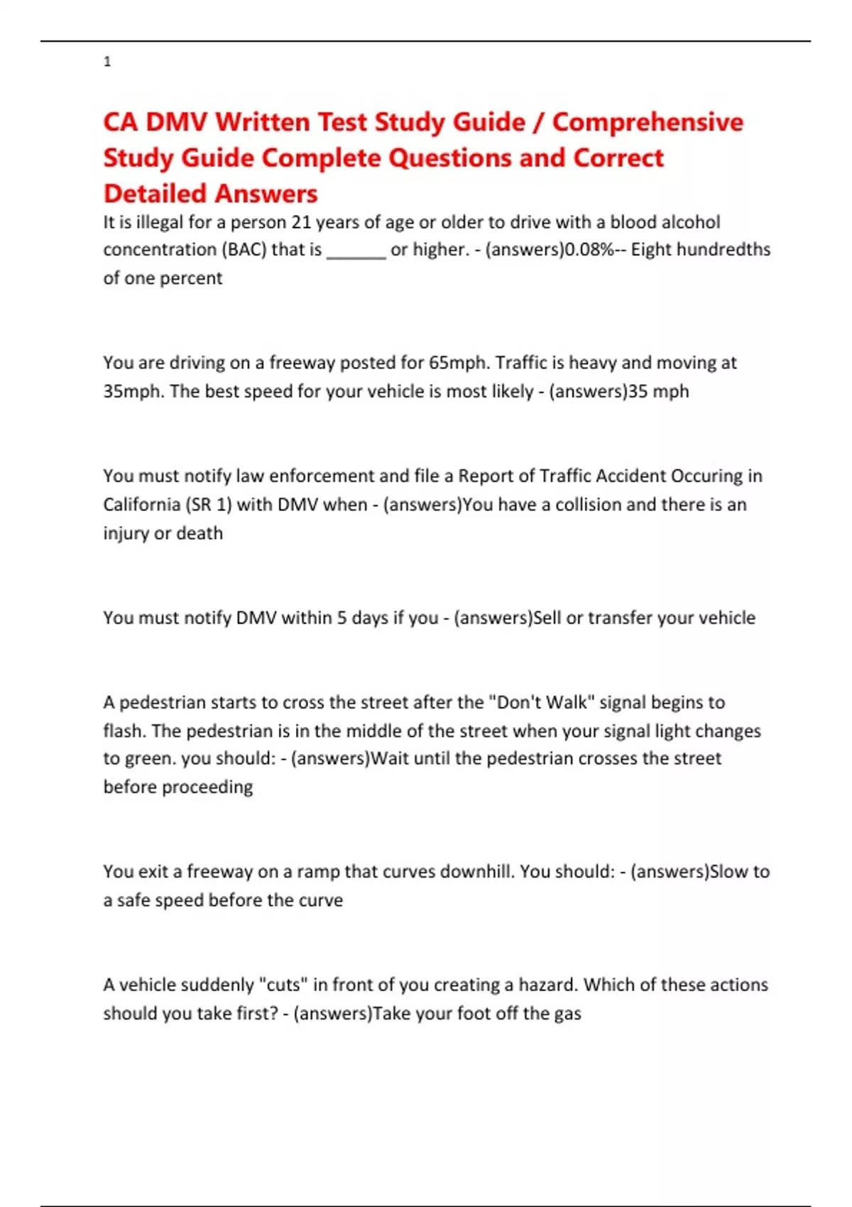 CA DMV Written Test Study Guide / Comprehensive Study Guide Complete Questions and Correct Detailed Answers