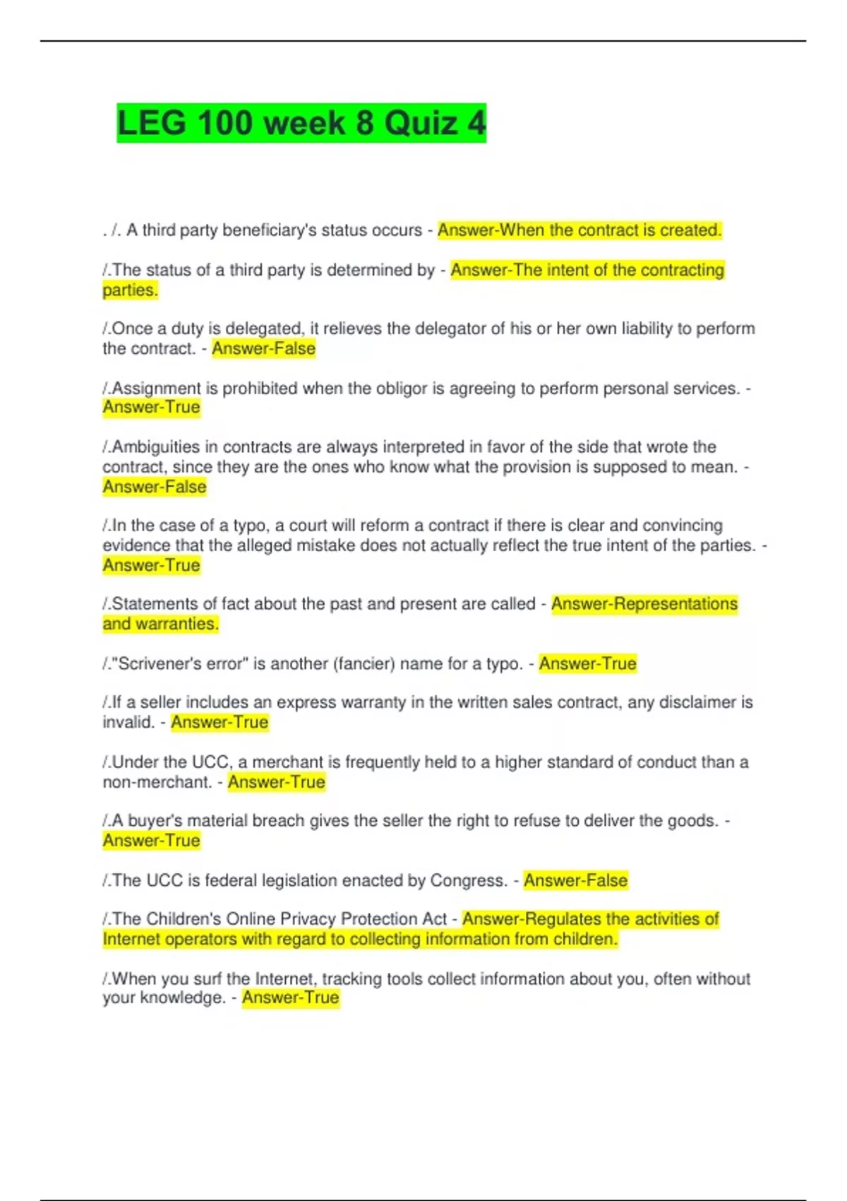 LEG 100 week 8 Quiz 4 . /. A third party beneficiary's status occurs - Answer-When the contract is created. /.The status of a third party is determined by - Answer-The intent of the contracting parties. /.Once a duty is delegated, it relieves the delegator of his or her own liability to perform the contract. - Answer-False /.Assignment is prohibited when the obligor is agreeing to perform personal services. - Answer-True /.Ambiguities in contracts are always interpreted in favor of the side that wrote the contract, since they are the ones who know what the provision is supposed to mean. - Answer-False /.In the case of a typo, a court will reform a contract if there is clear and convincing evidence that the alleged mistake does not actually reflect the true intent of the parties. - Answer-True /.Statements of fact about the past and present are called - Answer-Representations and warranties. /."Scrivener's error" is another (fancier) name for a typo. - Answer-True /.If a seller includes an express warranty in the written sales contract, any disclaimer is invalid. - Answer-True /.Under the UCC, a merchant is frequently held to a higher standard of conduct than a non-merchant. - Answer-True /.A buyer's material breach gives the seller the right to refuse to deliver the goods. - Answer-True /.The UCC is federal legislation enacted by Congress. - Answer-False /.The Children's Online Privacy Protection Act - Answer-Regulates the activities of Internet operators with regard to collecting information from children. /.When you surf the Internet, tracking tools collect information about you, often without your knowledge. - Answer-True