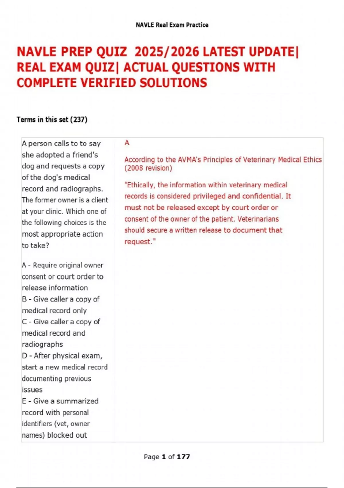 Terms in this set (237) A person calls to to say she adopted a friend's dog and requests a copy of the dog's medical record and radiographs. The former owner is a client at your clinic. Which one of the following choices is the most appropriate action to take? A - Require original owner consent or court order to release information B - Give caller a copy of medical record only C - Give caller a copy of medical record and radiographs D - After physical exam, start a new medical record documenting previous issues E - Give a summarized record with personal identifiers (vet, owner names) blocked out A According to the AVMA's Principles of Veterinary Medical Ethics (2008 revision) "Ethically, the information within veterinary medical records is considered privileged and confidential. It must not be released except by court order or consent of the owner of the patient. Veterinarians should secure a written release to document that request." NAVLE Real Exam Practice Page 2 of 177 A 5 year old domestic short-haired spayed female cat is presented with the complaints of anorexia, chronic vomiting, and weight loss. Physical examination reveals icterus, dehydration, and fever. Thickened small intestinal loops are appreciated with abdominal palpation, and serum biochemistry shows increased bilirubin and liver enzymes. The cat is diagnosed with extrahepatic biliary obstruction with accompanying cholangitis and inflammatory bowel disease. Which one of the following normal anatomic features may predispose cats to this triad of diseases? A - Narrowing of the duodenum distal to the entry of the common bile and pancreatic ducts B - Common opening of the pancreatic and common bile ducts into duodenum C - Enlarged duodenal papilla in B In cats, there is a common opening of the pancreatic and common bile ducts into the duodenum. It is thought that this may predispose them to ascending cholangitis and pancreatitis after vomiting associated with inflammatory bowel disease, resulting in extrahepatic biliary obstruction. Other possible etiologies of EHBO include neoplasia, biliary stricture, duodenal obstruction, diaphragmatic hernia, and parasitic infection. In all cases, there is a lack of bile entry into the intestinal tract, leading to decreased absorption of fat and fat soluble vitamins such as vitamin K, potentially resulting in coagulopathies. Except in transient cases that are related to acute pancreatitis, surgical intervention to relieve the obstruction is required as well as appropriate supportive care, antimicrobial treatment, and vitamin K administration. NAVLE Real Exam Practice Page 3 of 177 comparison to other species D - Decreased proportion of alpha- smooth muscle actin in muscle fibers of the wall of the gall bladder in cats E - Decreased diameter and increased branching of the hepatic ducts in comparison to other species Most of a litter of European wild boar at a zoological park have died. The surviving piglets are in lateral recumbency with a frothy nasal discharge. Necropsy of the piglets reveals pulmonary edema and copious fluid in the trachea and bronchi along with grayish- white necrotic foci on the myocardium. Which one of the B Encephalomyocarditis virus