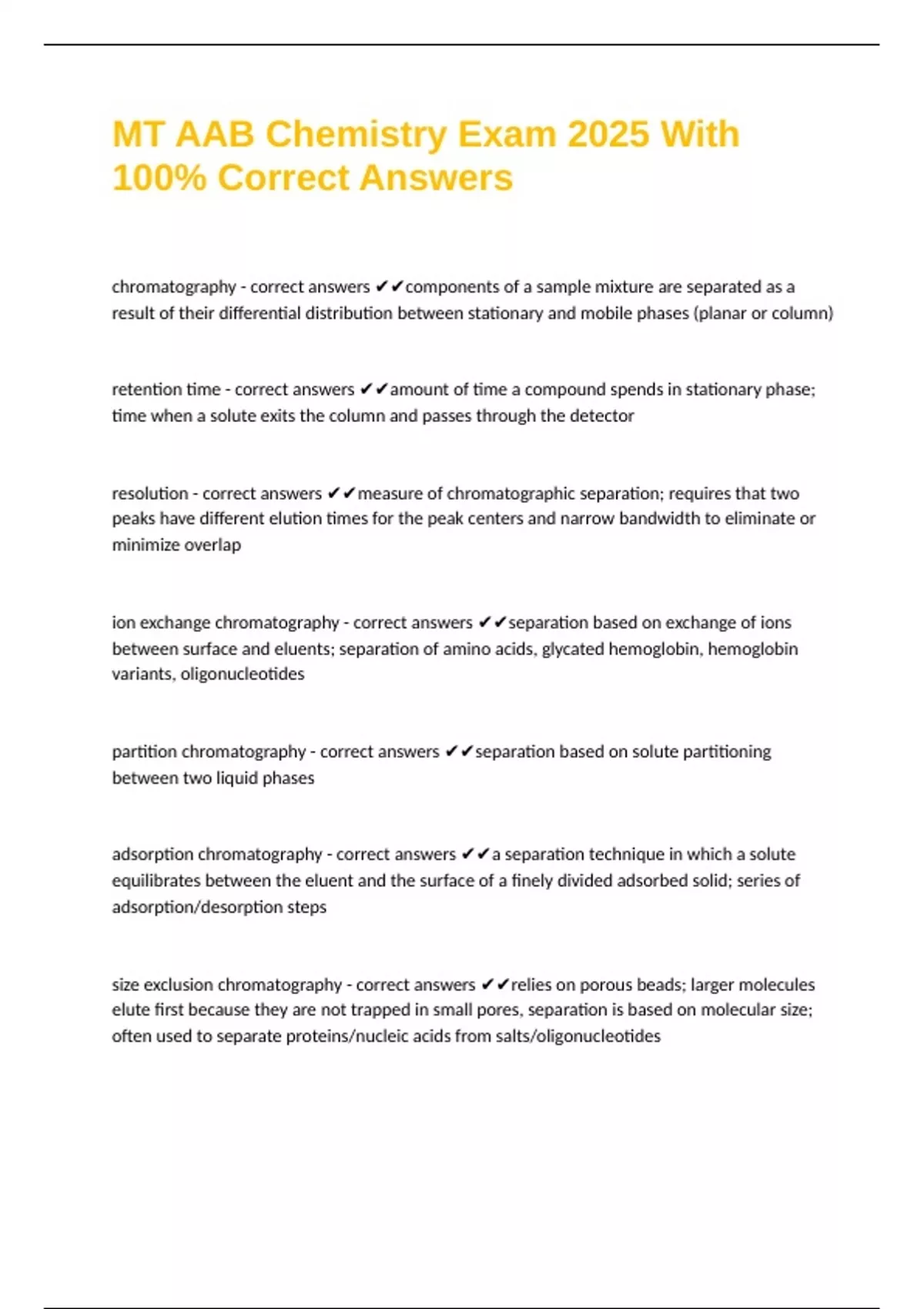 resolution - correct answers ✔✔measure of chromatographic separation; requires that two