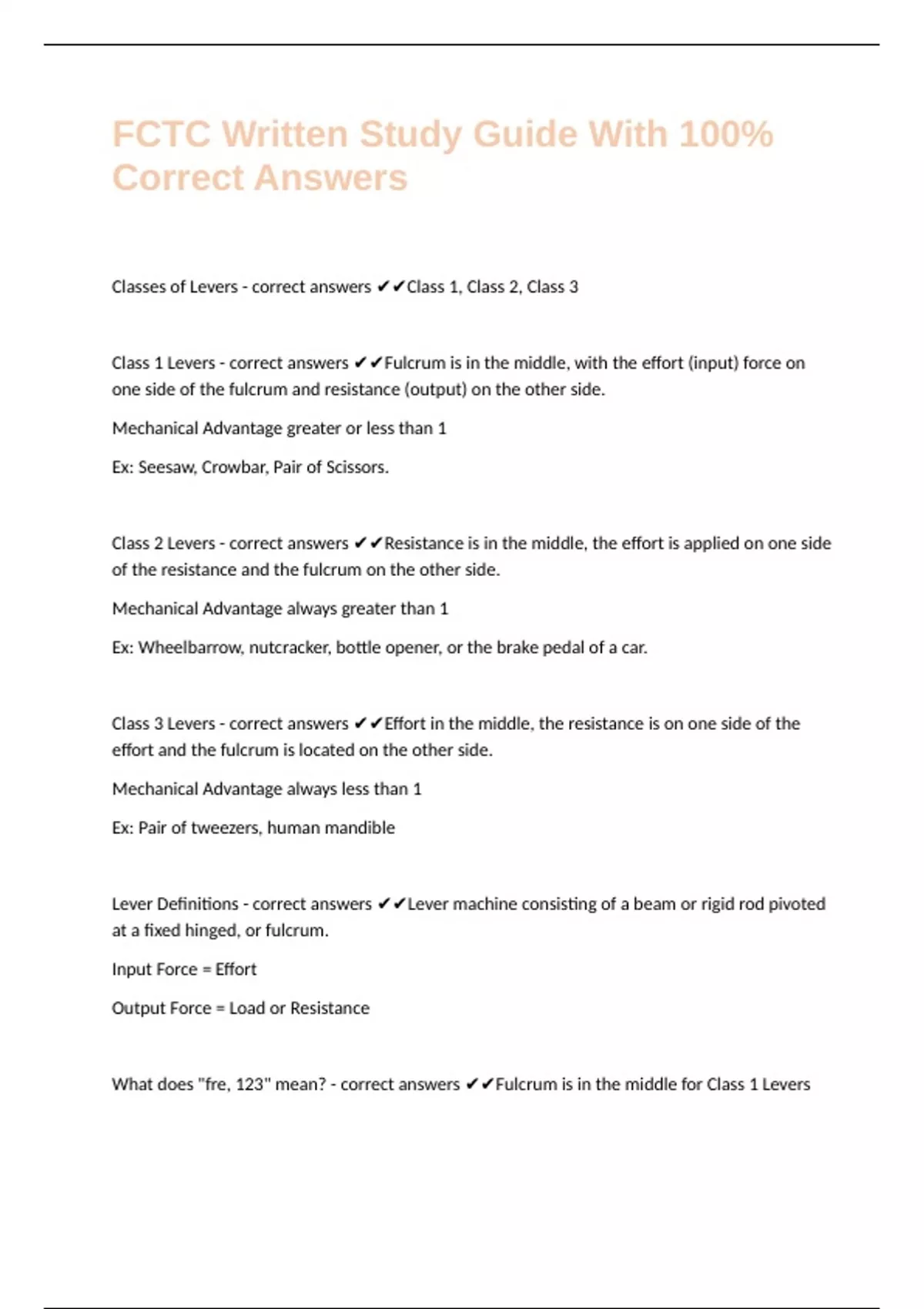 Classes of Levers - correct answers Class 1, Class 2, Class 3 Class 1 Levers - correct answers Fulcrum is in the middle, with the effort (input) force on one side of the fulcrum and resistance (output) on the other side. Mechanical Advantage greater or less than 1 Ex: Seesaw, Crowbar, Pair of Scissors. Class 2 Levers - correct answers Resistance is in the middle, the effort is applied on one side of the resistance and the fulcrum on the other side. Mechanical Advantage always greater than 1 Ex: Wheelbarrow, nutcracker, bottle opener, or the brake pedal of a car. Class 3 Levers - correct answers Effort in the middle, the resistance is on one side of the effort and the fulcrum is located on the other side. Mechanical Advantage always less than 1 Ex: Pair of tweezers, human mandible Lever Definitions - correct answers Lever machine consisting of a beam or rigid rod pivoted at a fixed hinged, or fulcrum. Input Force = Effort Output Force = Load or Resistance What does "fre, 123" mean? - correct answers Fulcrum is in the middle for Class 1 Levers