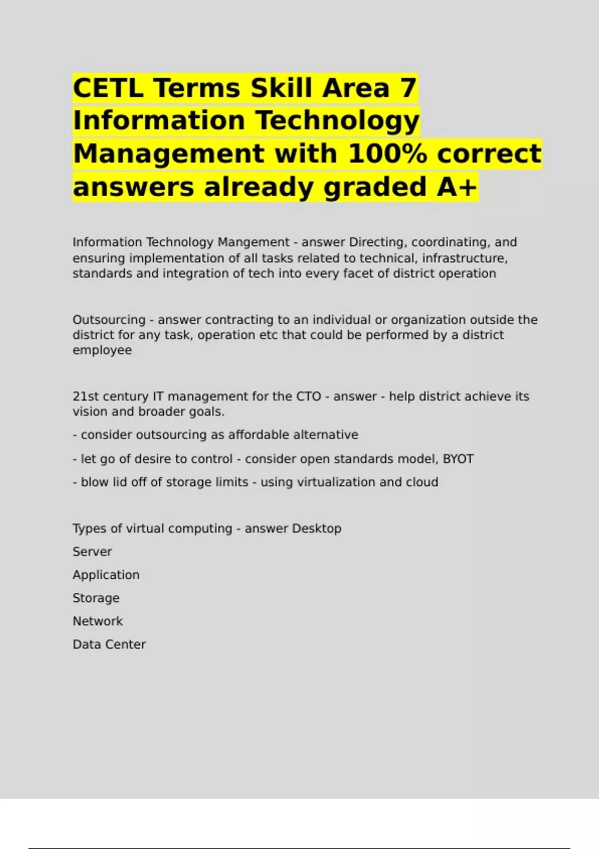 CETL Terms Skill Area 7 Information Technology Management with 100- correct answers