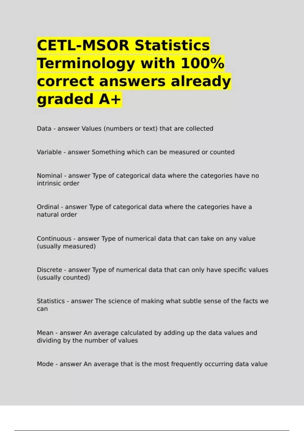 CETL-MSOR Statistics Terminology with 100- correct answers already graded A+.