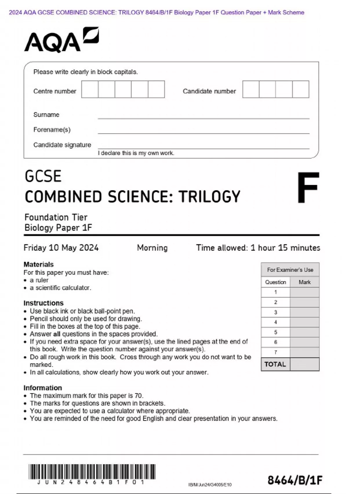 2024 AQA GCSE COMBINED SCIENCE: TRILOGY 8464/B/1F Biology Paper 1F Question Paper + Mark Scheme Actual 2024 AQA GCSE COMBINED SCIENCE: TRILOGY 8464/B/1F Biology Paper 1F Merged Question Paper + Mark Scheme