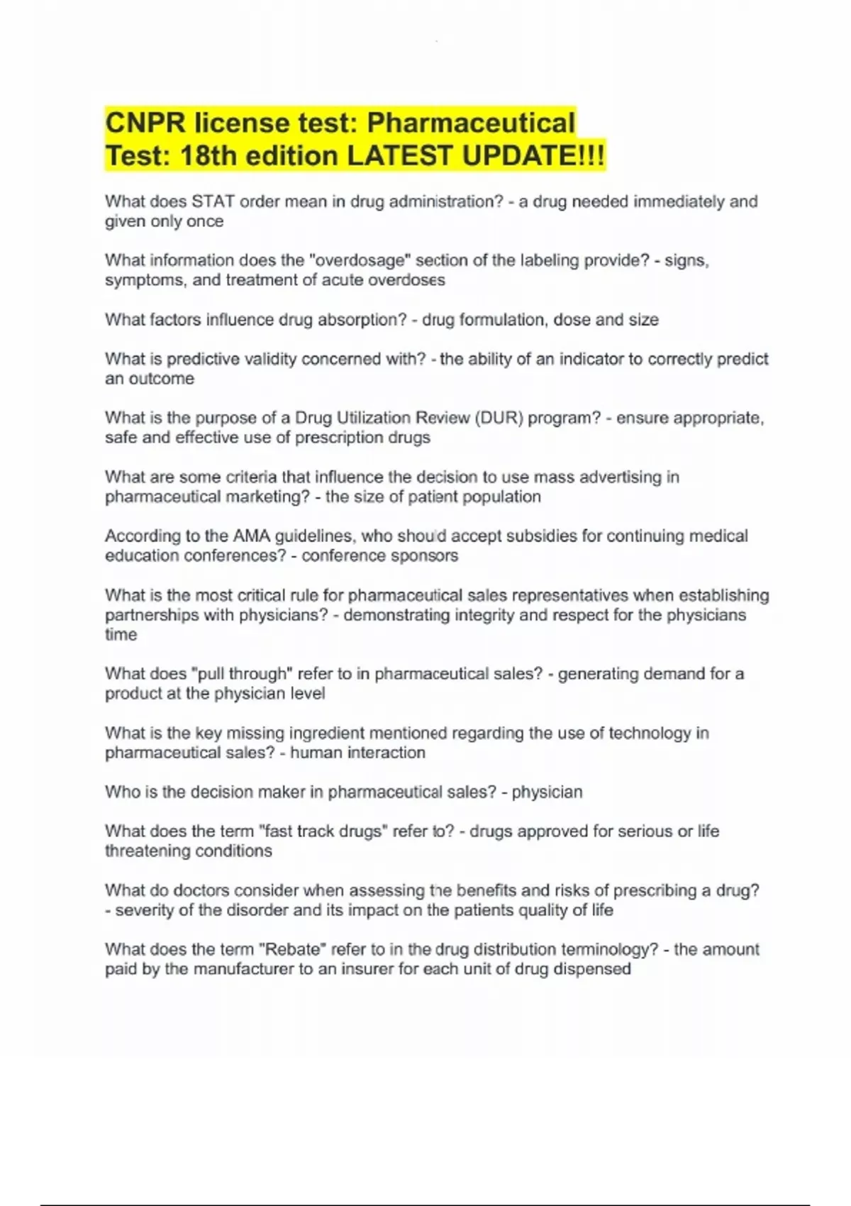 CNPR license test- Pharmaceutical Test 18th edition LATEST UPDATE!!! CNPR license test- Pharmaceutical Test 18th edition LATEST UPDATE!!!