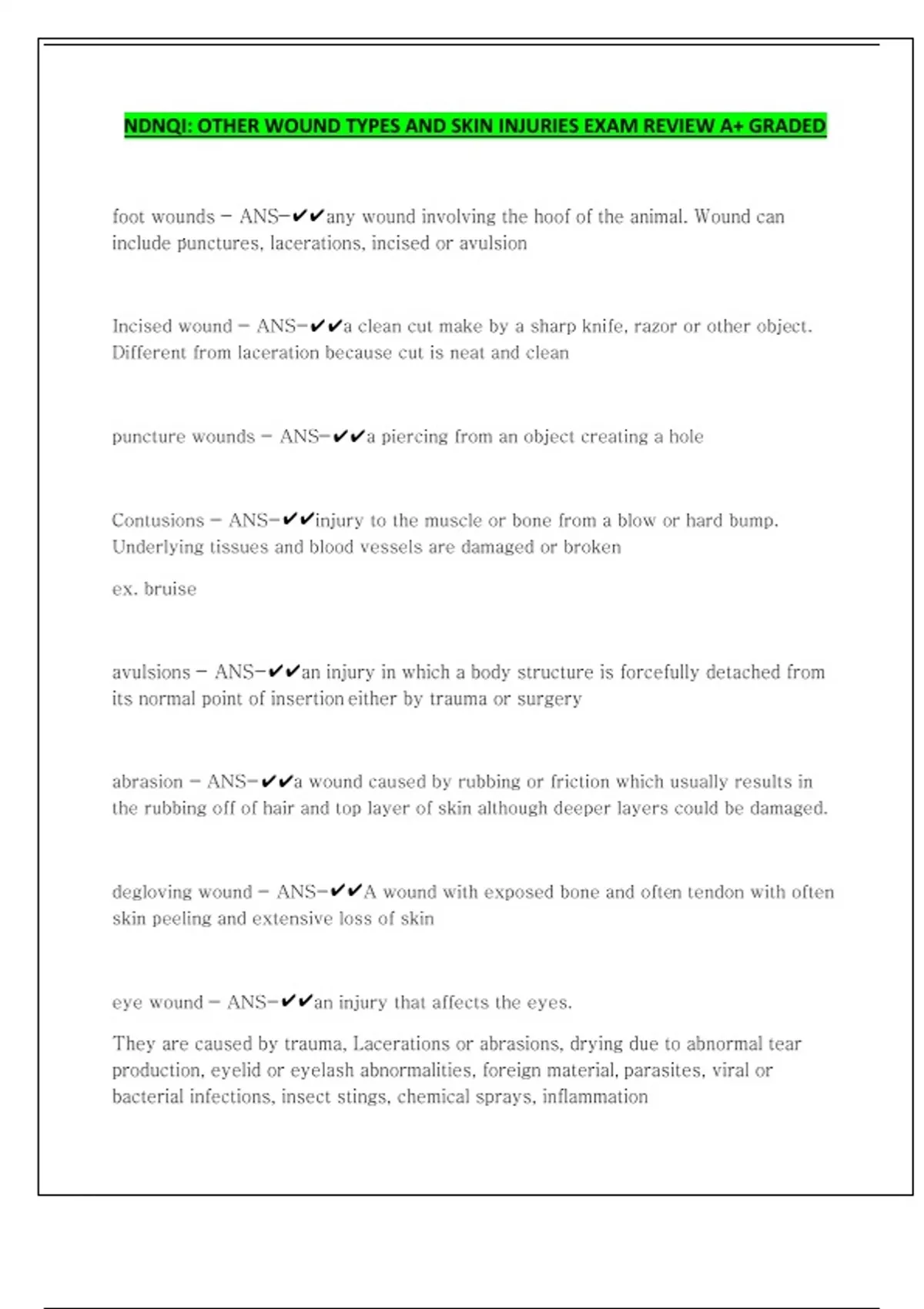 NDNQI: OTHER WOUND TYPES AND SKIN INJURIES EXAM REVIEW A+ GRADED foot wounds - ANS-any wound involving the hoof of the animal. Wound can include punctures, lacerations, incised or avulsion Incised wound - ANS-a clean cut make by a sharp knife, razor or other object. Different from laceration because cut is neat and clean puncture wounds - ANS-a piercing from an object creating a hole Contusions - ANS-injury to the muscle or bone from a blow or hard bump. Underlying tissues and blood vessels are damaged or broken ex. bruise avulsions - ANS-an injury in which a body structure is forcefully detached from its normal point of insertion either by trauma or surgery abrasion - ANS-....