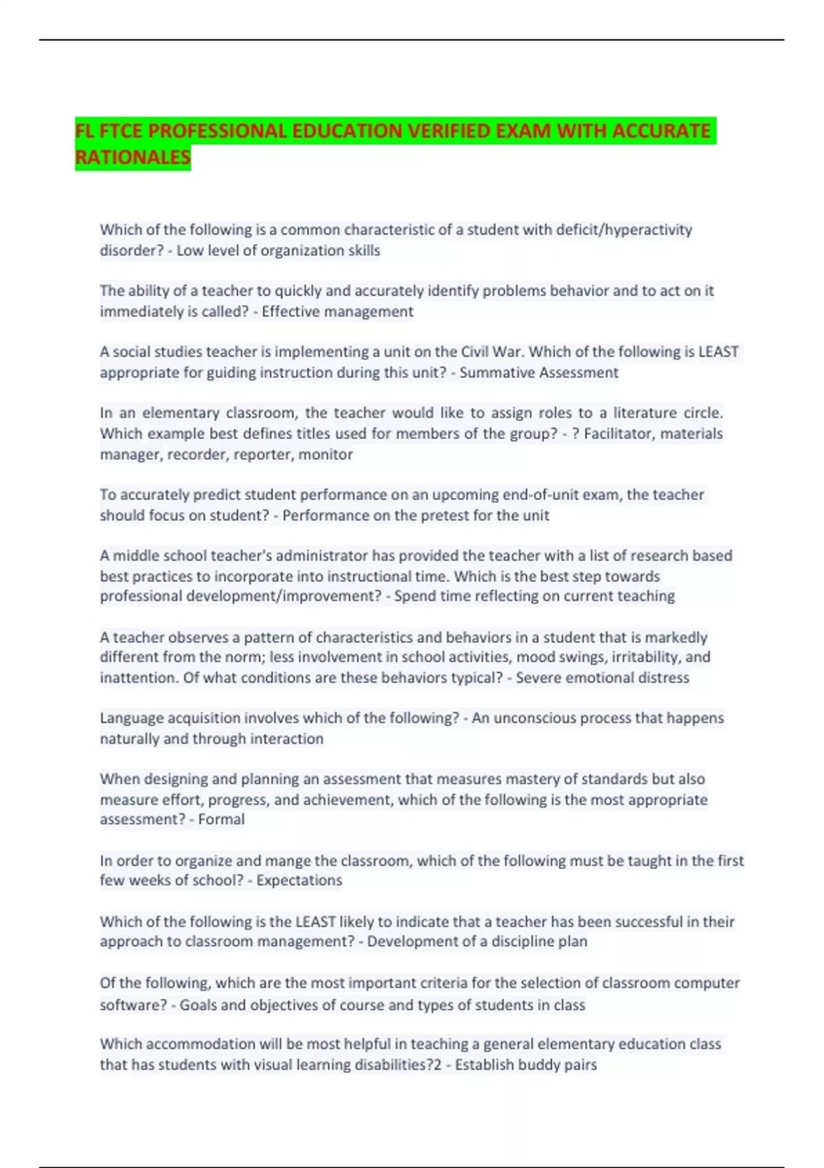 FL FTCE PROFESSIONAL EDUCATION VERIFIED EXAM WITH ACCURATE