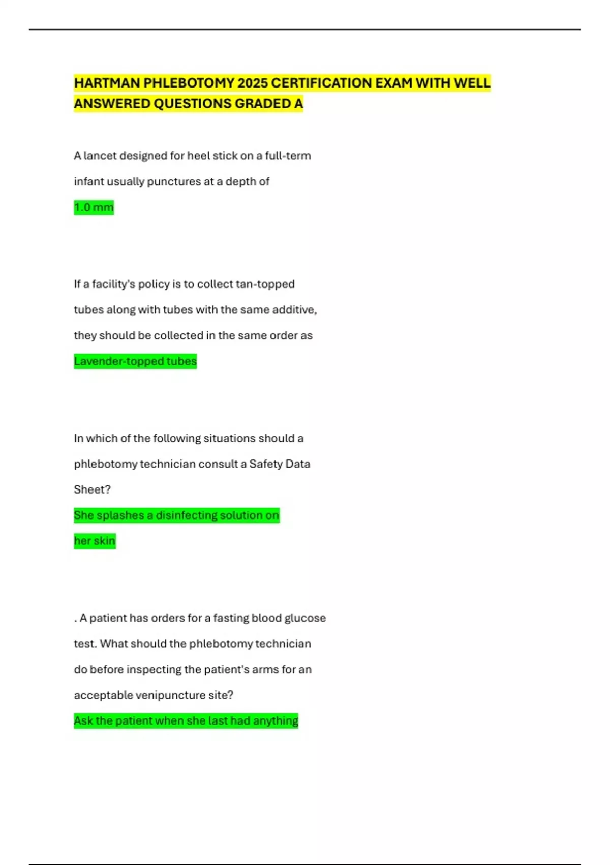 HARTMAN PHLEBOTOMY 2025 CERTIFICATION EXAM WITH WELL ANSWERED QUESTIONS GRADED A