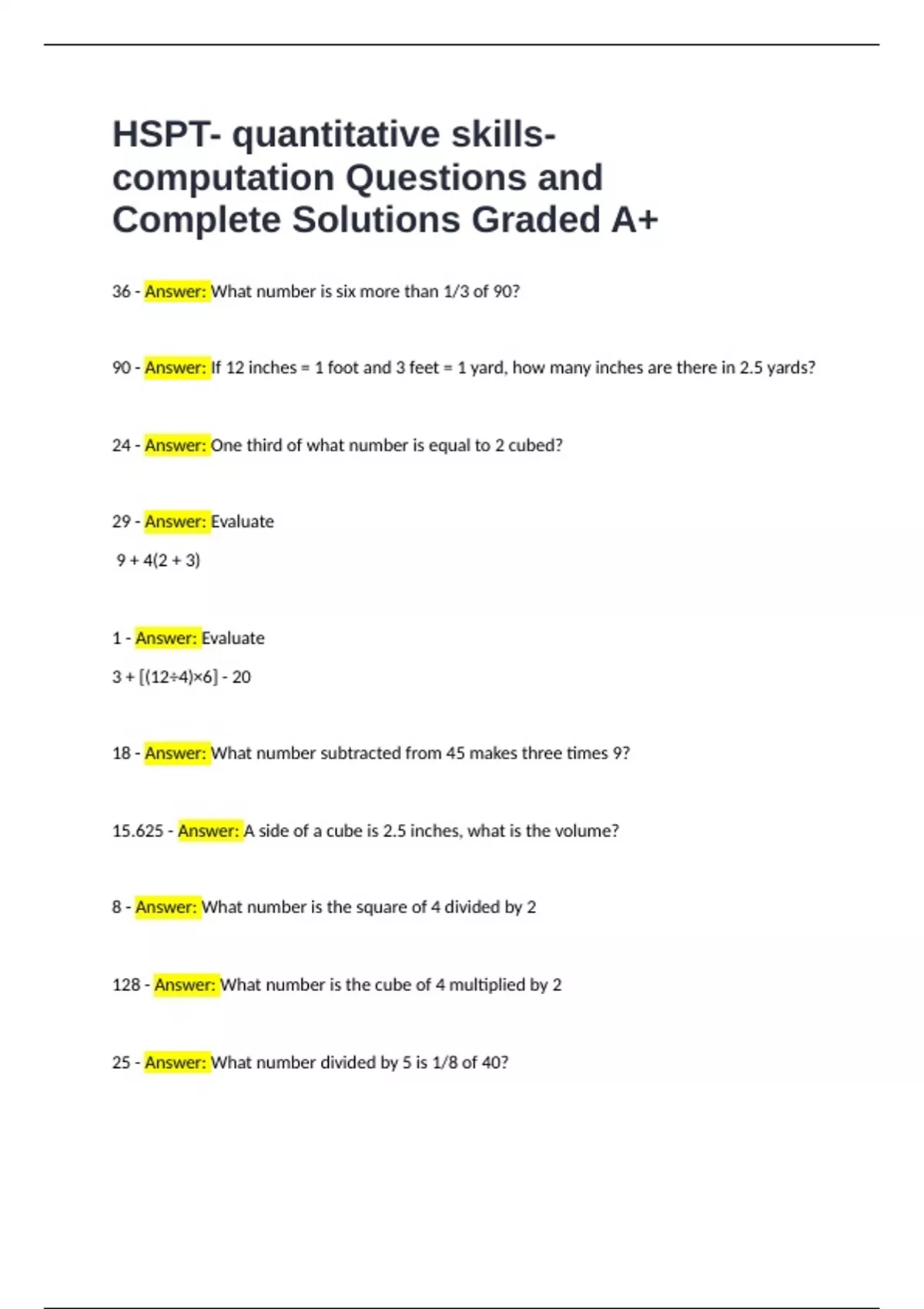 HSPT- quantitative skills-computation Questions with Complete Solutions Graded A+