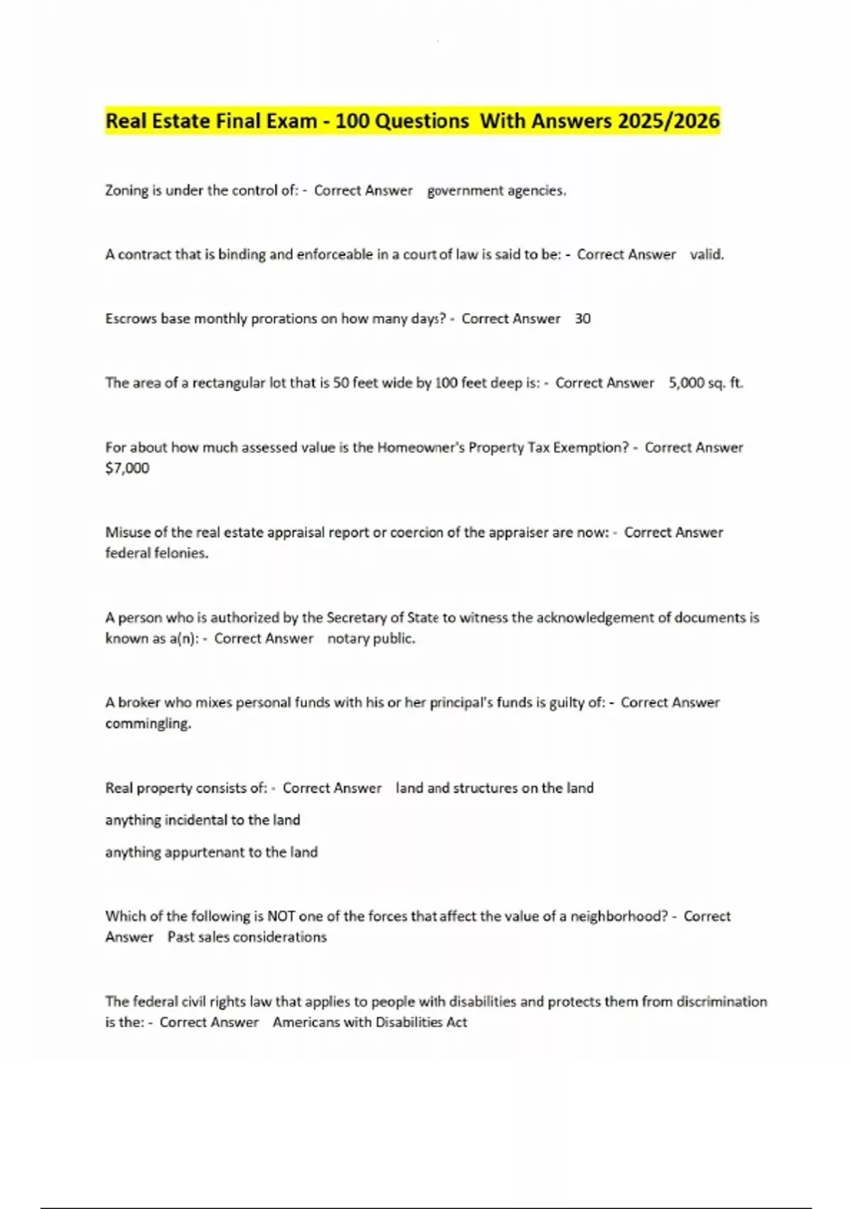 Real Estate Final Exam - 100 Questions With Answers 2025/2026 Zoning is under the control of: - Correct Answer government agencies. A contract that is binding and enforceable in a court of law is said to be: - Correct Answer valid. Escrows base monthly prorations on how many days? - Correct Answer 30 The area of a rectangular lot that is 50 feet wide by 100 feet deep is: - Correct Answer 5,000 sq. ft. For about how much assessed value is the Homeowner's Property Tax Exemption? - Correct Answer $7,000 Misuse of the real estate appraisal report or coercion of the appraiser are now: - Correct Answer federal felonies. A person who is authorized by the Secretary of State to witness the acknowledgement of documents is known as a(n): - Correct Answer notary public.