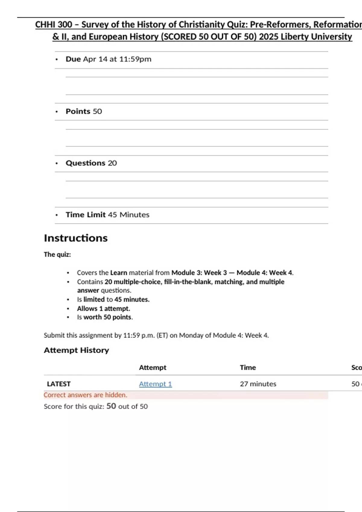 CHHI 300 – Survey of the History of Christianity Quiz: Pre-Reformers, Reformation I & II, and European History (SCORED 50 OUT OF 50) 2025 Liberty University