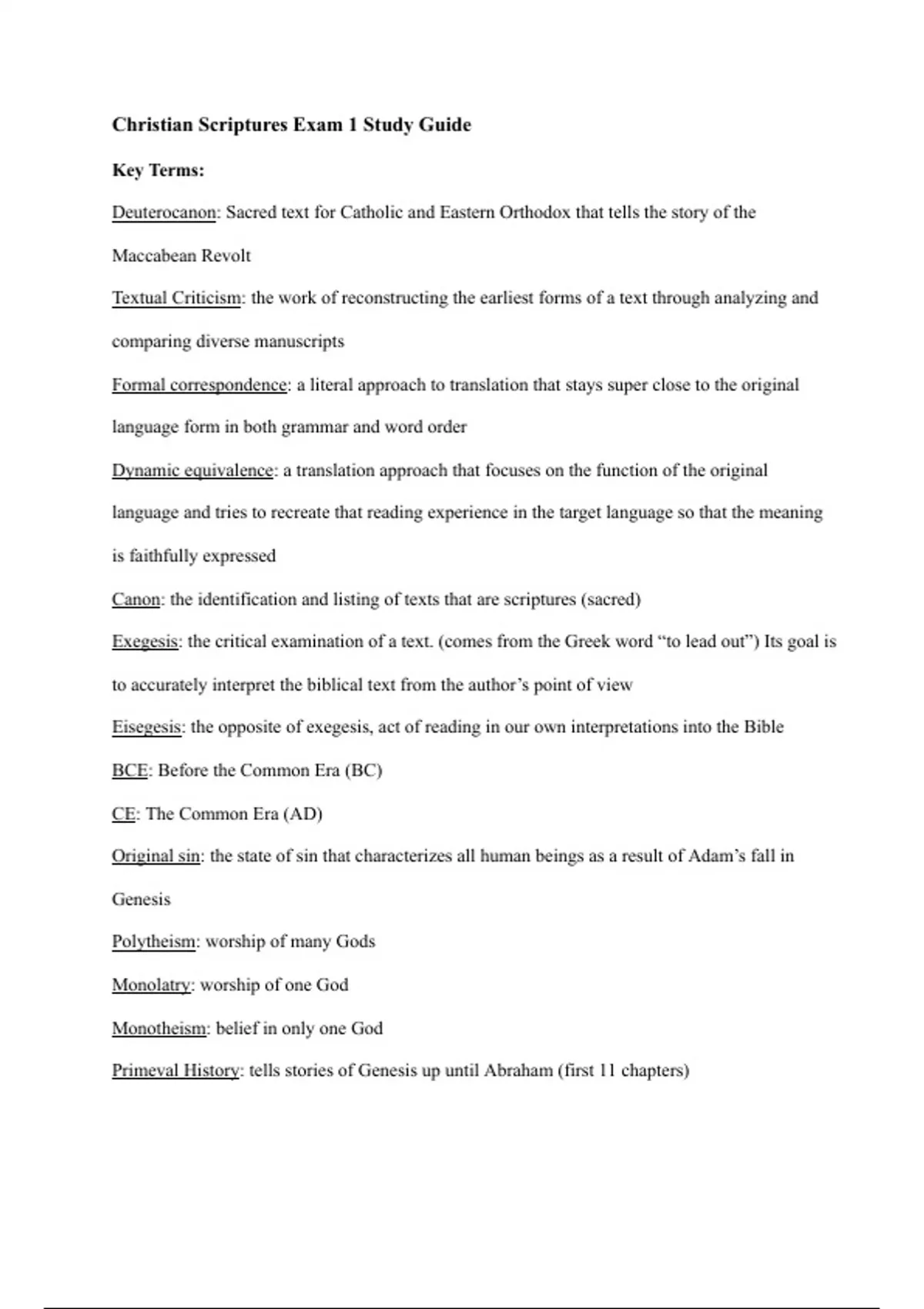 Christian Scriptures Unit 1 Study Guide. Key terms, plots, characters, and themes. Covers most of the Old Testament.