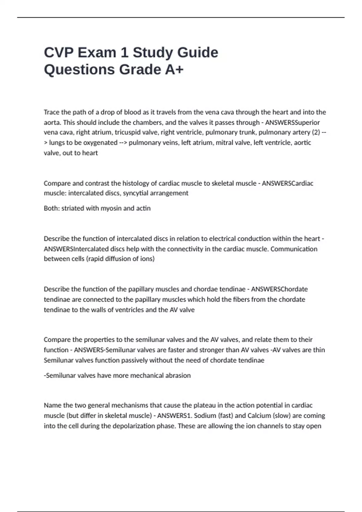 CVP Exam 1 Study Guide Questions Grade A+ Trace the path of a drop of blood as it travels from the vena cava through the heart and into the aorta. This should include the chambers, and the valves it passes through - ANSWERSSuperior vena cava, right atrium, tricuspid valve, right ventricle, pulmonary trunk, pulmonary artery (2) --> lungs to be oxygenated --> pulmonary veins, left atrium, mitral valve, left ventricle, aortic valve, out to heart Compare and contrast the histology of cardiac muscle to skeletal muscle - ANSWERSCardiac muscle: intercalated discs, syncytial arrangement Both: striated with myosin and actin Describe the function of intercalated discs in relation to electrical conduction within the heart - ANSWERSIntercalated discs help with the connectivity in the cardiac muscle. Communication between cells (rapid diffusion of ions) Describe the function of the papillary muscles and chordae tendinae - ANSWERSChordate tendinae are connected to the papillary muscles which hold the fibers from the chordate tendinae to the walls of ventricles and the AV valve Compare the properties to the semilunar valves and the AV valves, and relate them to their function - ANSWERS-Semilunar valves are faster and stronger than AV valves -AV valves are thin Semilunar valves function passively without the need of chordate tendinae -Semilunar valves have more mechanical abrasion Name the two general mechanisms that cause the plateau in the action potential in cardiac muscle (but differ in skeletal muscle) - ANSWERS1. Sodium (fast) and Calcium (slow) are coming into the cell during the depolarization phase. These are allowing the ion channels to stay open